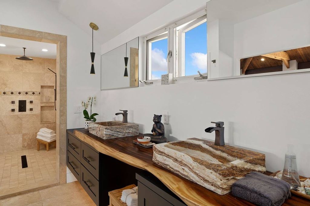 Upgrades and unique features include new roof/gutters/facia, new 30-panel PV system with 2 Tesla batteries, Fleetwood hurricane windows, new entry gates, two porte-cocheres, hand-carved Balinese entry doors, LED lighting inside and out, new top-of-the-line Thermador appliances, new butler's pantry/laundry room, two new sets of washers/dryers, and more. Examples of the fine finishes include Slate, Brazilian Koa Tigerwood, Quartz, Travertine, and Ipe. Net metering means no electricity bill! Detailed list of features and upgrades attached in MLS.