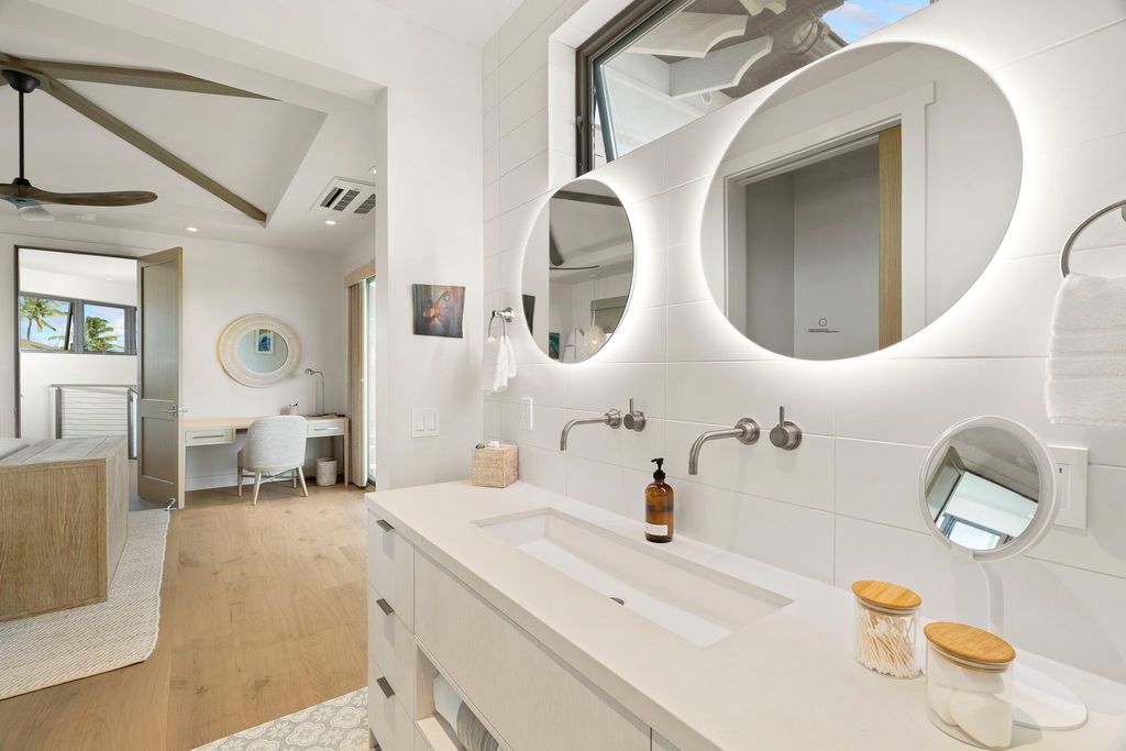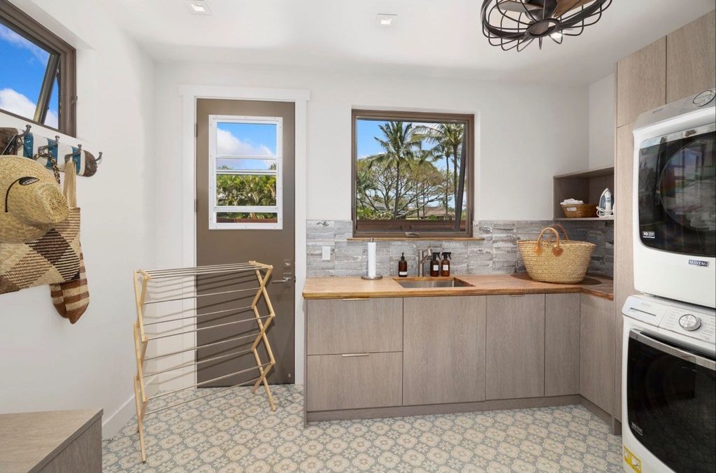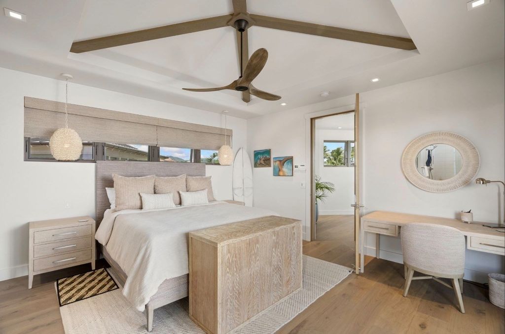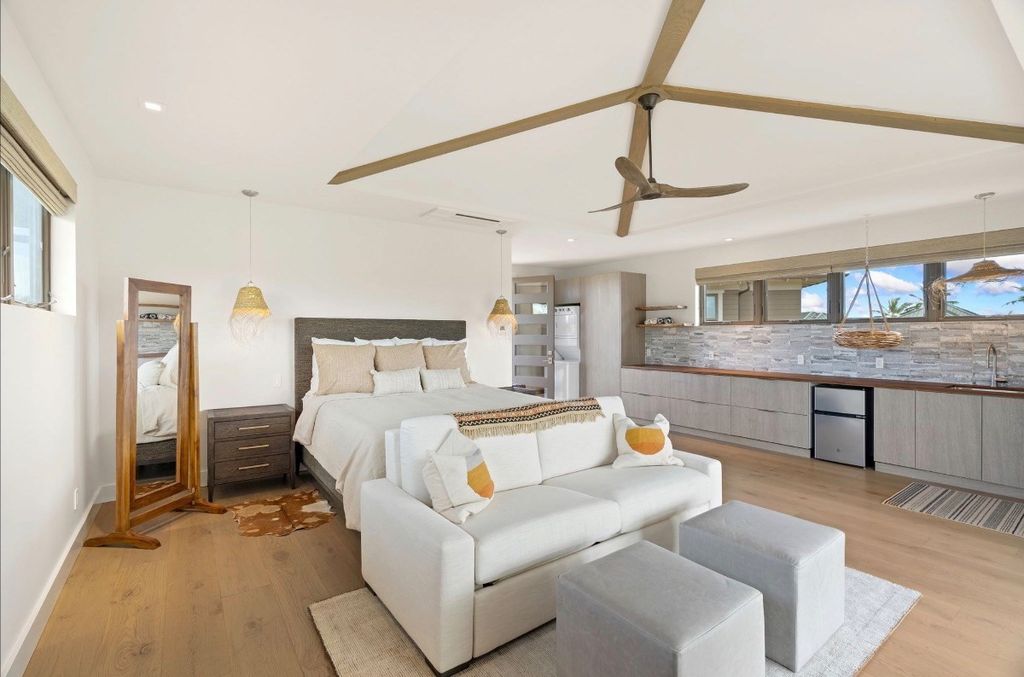 The main residence features two spacious primary suites, each designed with elegant bathrooms, ample closet space, and refined finishes. The upper-level suite takes luxury to another level, boasting stunning ocean views. For added flexibility, the detached Ê»ohana unit offers more than 800 square feet of private living and lÄnai space, complete with a stackable washer/dryer, microwave drawer, under-counter refrigerator, and toaster oven"”ideal for hosting guests or extended family.