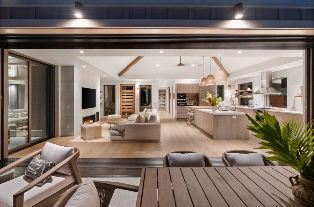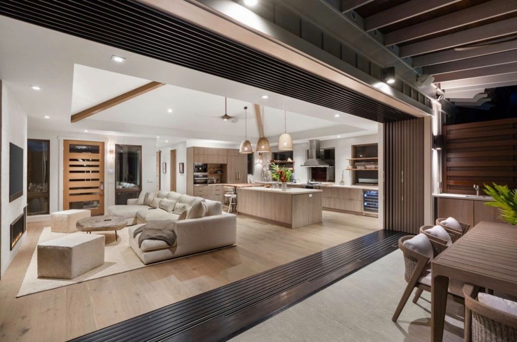 A dramatic 23-foot Fleetwood pocket slider in the living room seamlessly extends the space to the outdoor dining and pool areas, creating an ideal setting for entertaining or peaceful relaxation. The neutral design palette exudes warmth and sophistication, enhancing the home's natural beauty.