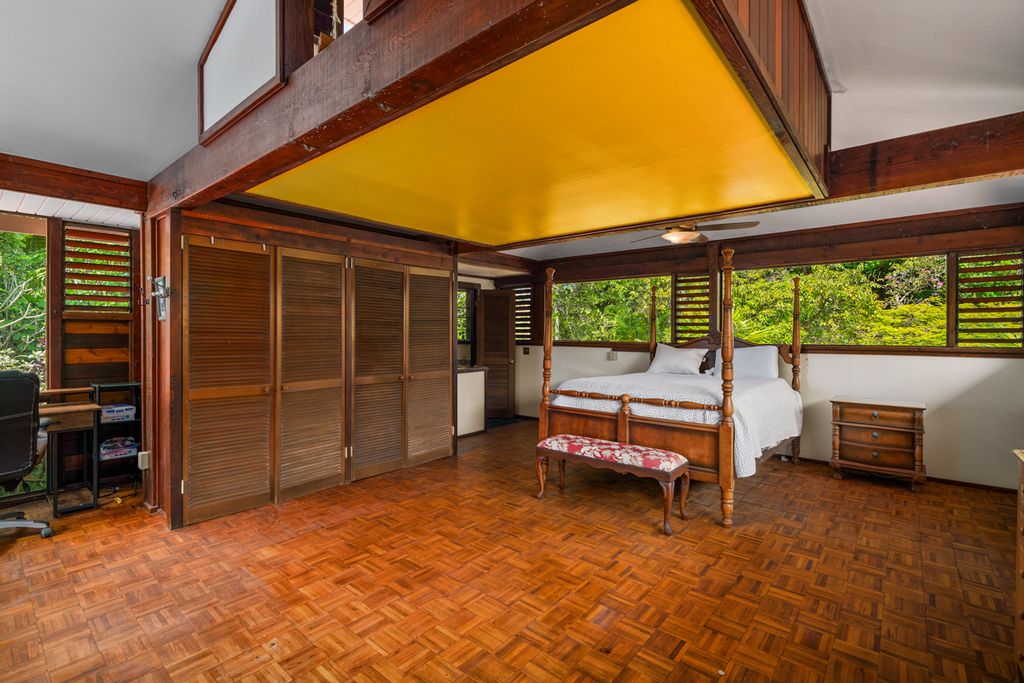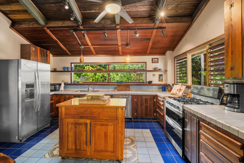 Haena is a special place on the Island of Kauai. It is the yesteryear of time, pace, relationships, and lifestyle. This property emphasizes these characteristics in every way. Hawaiian style, all the way. You are about 600' from the beach access. The main, 2-story/2bd/2ba, home is constructed of aged wood with a bright red corregated metal roof. The wooden interior of the home is accented with colorful patterns of tile, an abundance of shuttered windows and a very large screened lanai. No need for heaters or air conditioners here :-). The spacious kitchen has a beautiful wooden slab top island, natural wood cabinets, and space that can be used as a second bedroom or an additional formal dining area. The spacious master bedroom is singularly located on the 2nd floor. There is an attached spacious lanai for outdoor dining and socializing.