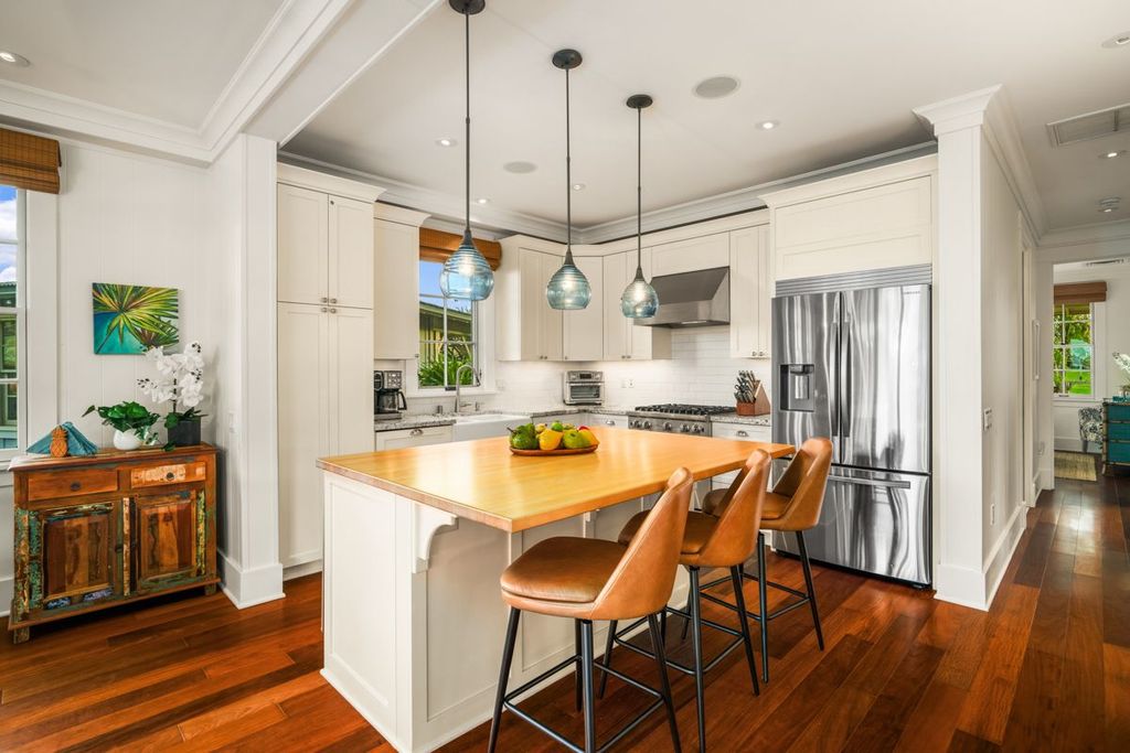 Designed for both gathering and culinary creativity, the bright and open kitchen features a spacious butcher block island with breakfast bar, granite countertops, subway tile backsplashes, and a new Samsung refrigerator. Wide-plank wood floors enhance the effortless sophistication, maintaining the relaxed, tropical feel of authentic Hawaiiana.