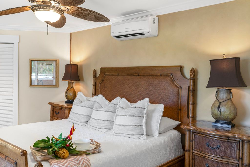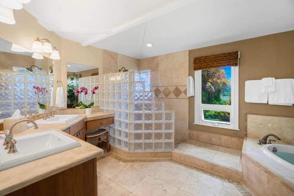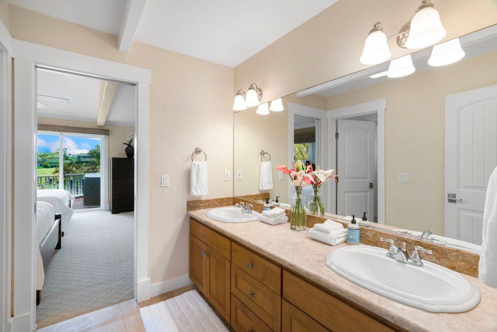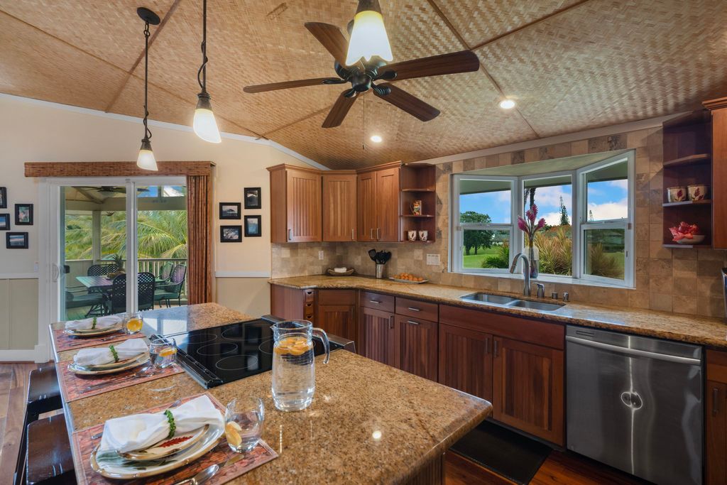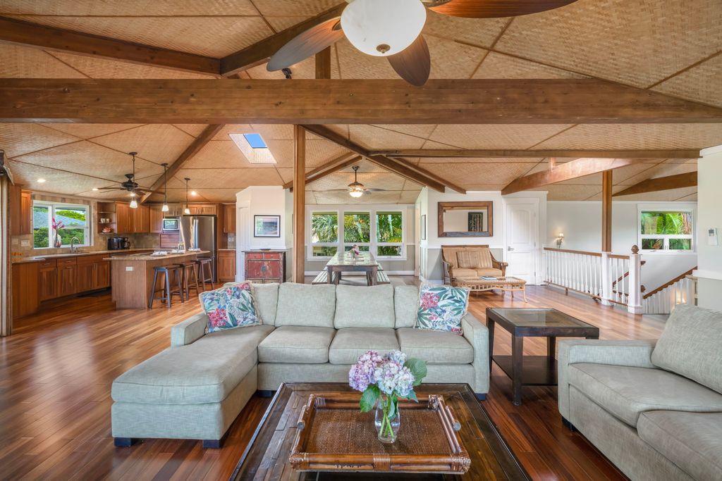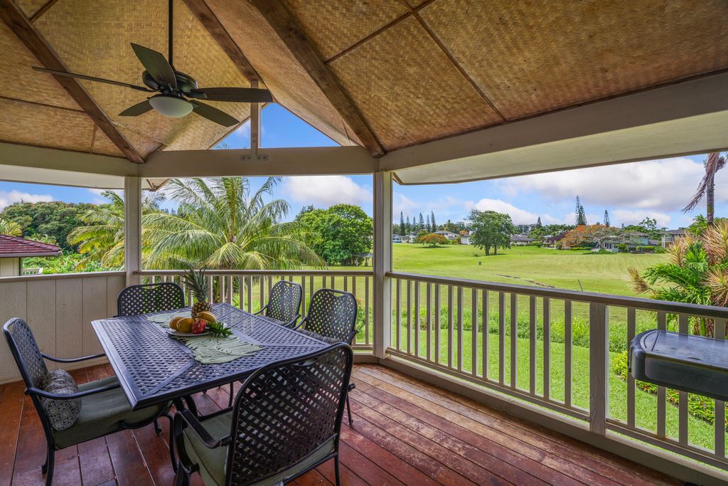 'Lola Hale' is located in central Princeville. This spacious 4 bedroom home sleeps 12. The upgraded two story home has hardwood floors, open beam ceilings and lanai on both floors. A large two car garage for all your beach and golf toys. The spacious kitchen has all the amenities for big family gatherings.There is a new hot tub and air conditioning throughout the house. With views of the Hanalei mountains and golf course you couldn't ask for more. Its just a short walk to Princeville Park and shopping center. A perfect family home or vacation home.