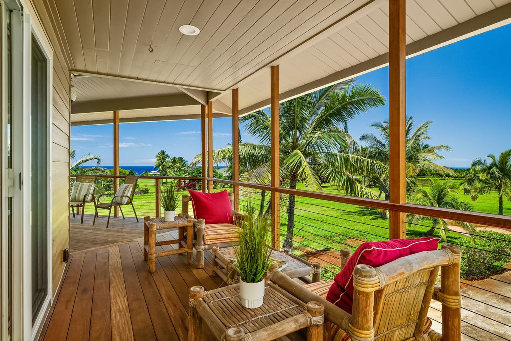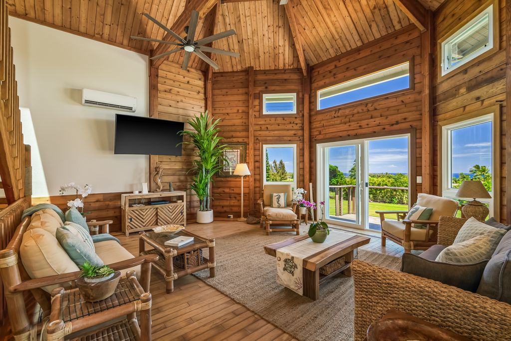Enjoy panoramic ocean and mountain views from this stunning estate in sought-after Aliomanu Estates. Set on over 4 acres of gently sloping land, this recently renovated 5-bedroom, 6-bathroom home offers the perfect blend of luxury, privacy, and island living.