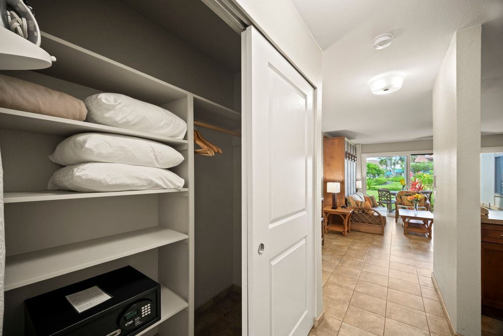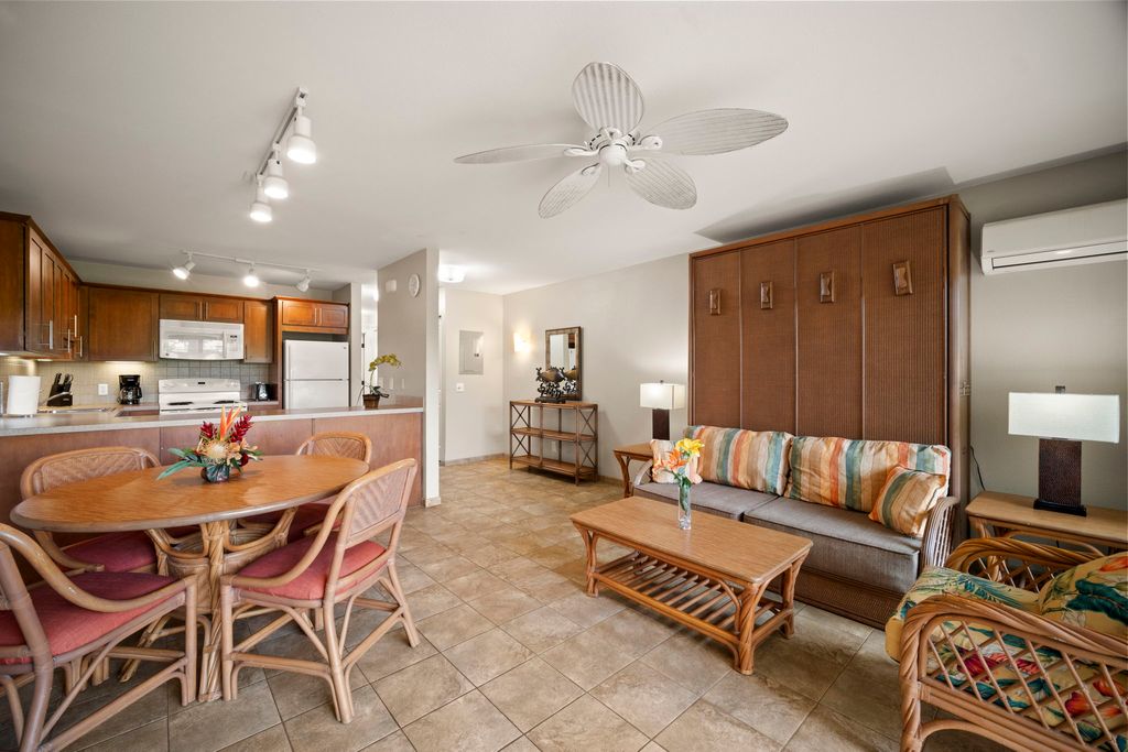 This fully furnished 1 bedroom, 1 bath condo in Pono Kai Resort is a successful vacation rental. The living room has a convenient sleeper sofa/wall bed that allows you to quickly turn the living room into an additional sleep zone. Unit H105 is conveniently located on the first floor, steps from the pool & the BBQ picnic area. The lanai is set back from the common areas, giving you more privacy during your stay. Inside, you have the option to enjoy the cool Kauai breeze or use your AC for hotter days. The laundry room is on site for convenience.