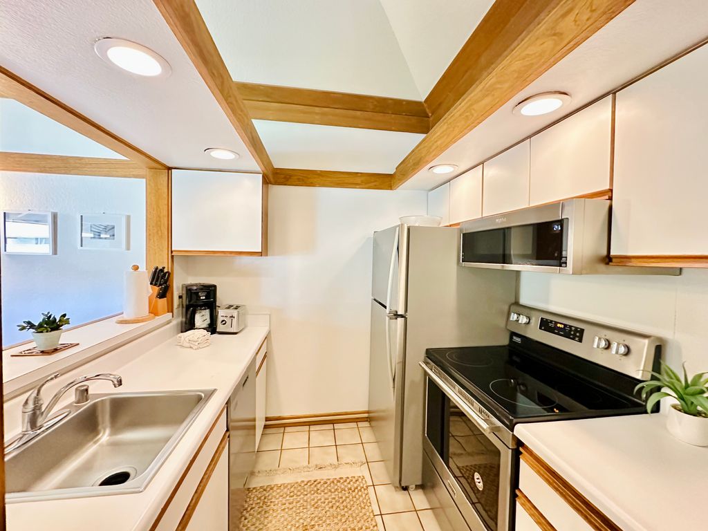 This fully furnished 1-bedroom top floor unit, 1-bath unit combines classic Hawaiian plantation-style charm with modern upgrades. Inside, you'll find cool AC, vaulted ceilings, a well-appointed kitchen with stainless steel appliances, a tastefully tiled full bathroom, and a bright living space that opens to a generous private lanai"”perfect for relaxing or entertaining.