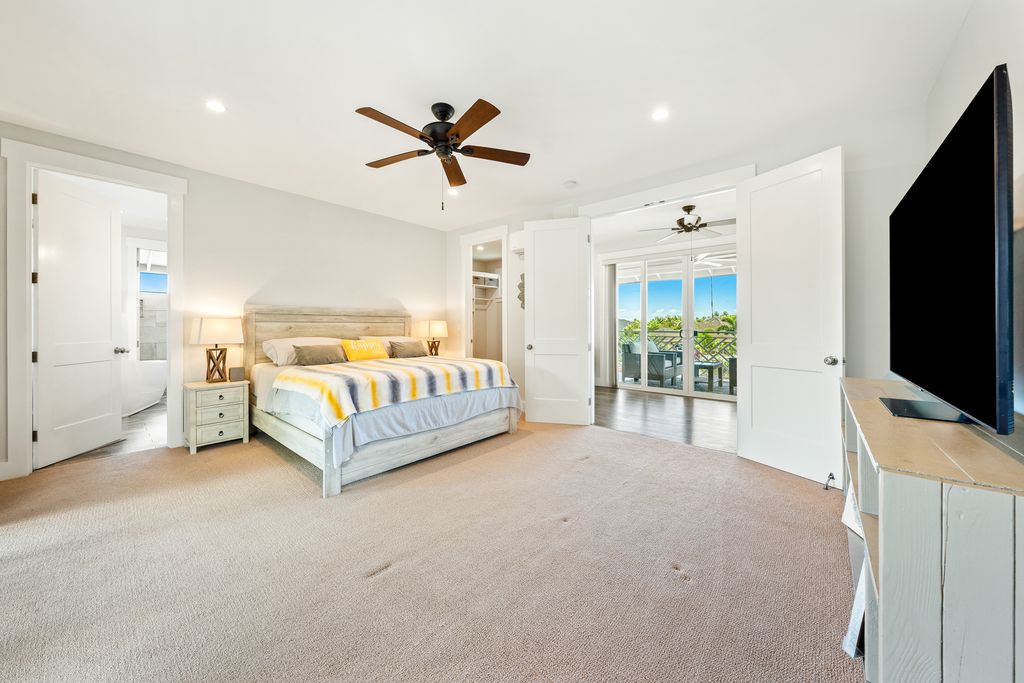 Fully furnished and thoughtfully equipped: split A/C systems, surround sound, in-wall speakers, and an 85" video screen. Energy-smart with 8.8 KW solar panels, 12 KW inverter, and 42 KW battery system. Yard irrigation included via Poipu Beach Estates.