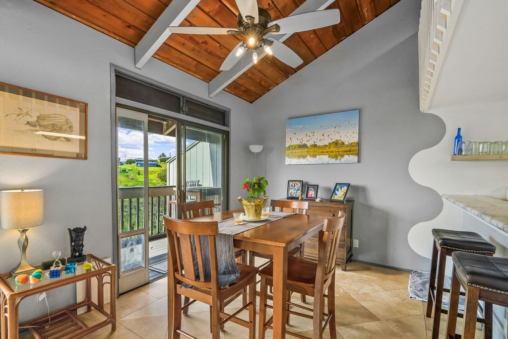 This spacious end unit features a 3-bedroom, 2-bathroom layout, a large storage area or workspace, and a loft area that is the largest in the Kalaheo Pali Kai complex "” ideal for a home office, extra sleeping space, or a dedicated media room. An inviting open floor plan seamlessly connects the living and dining areas, creating a spacious and welcoming feel throughout.