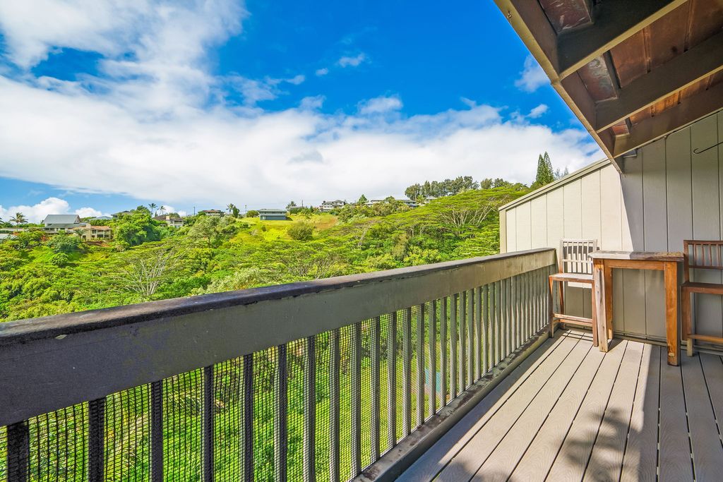 Step outside onto one of two private lanais. The upper, larger lanai, accessible directly from the dining area, offers expansive, distant ocean views and majestic Kauai mountains, while surrounded by a lush, green landscape.