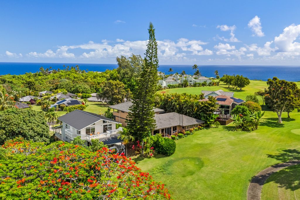 Located on an oversized lot along the 12th hole of the Makai Golf Course, this beautifully maintained four-bedroom, 2.5-bath home in Princeville captures sweeping views of the Makai golf course, mountains and waterfalls. Designed to embrace Kauai's indoor-outdoor lifestyle, the property includes multiple lanais, a private yard, and generous space for entertaining.