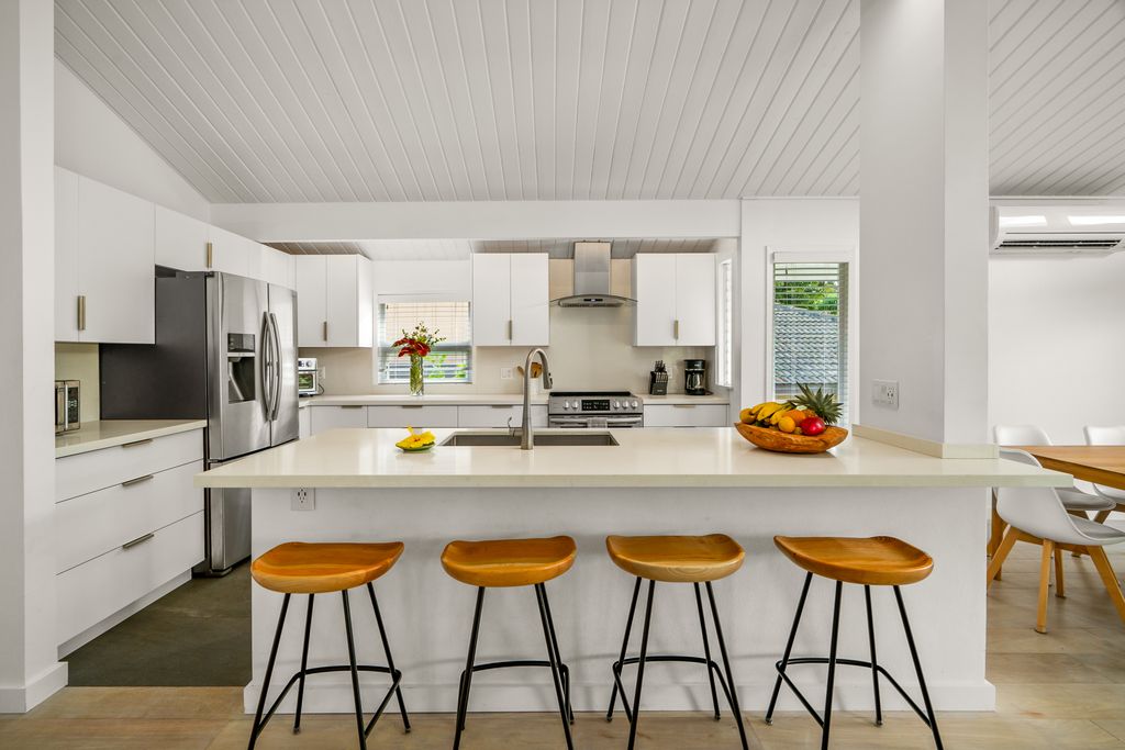 Oriented to take advantage of the island's cooling trade winds, the home remains breezy year-round, while split-system air conditioning in the upstairs living room and primary bedroom adds comfort on warmer days.