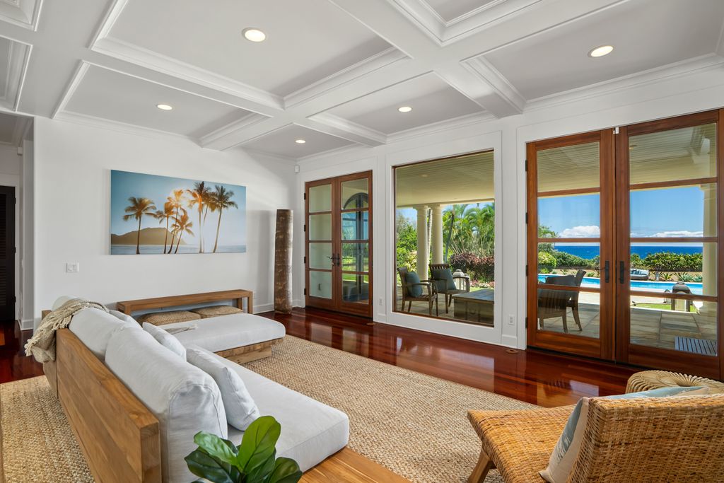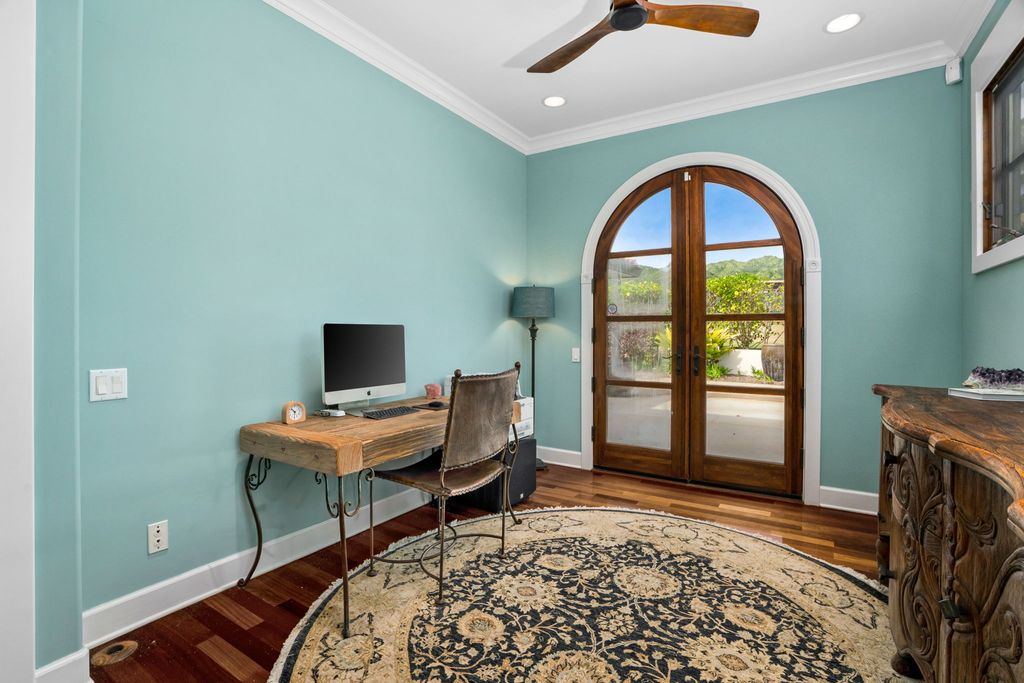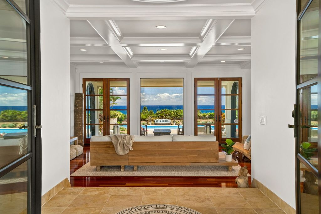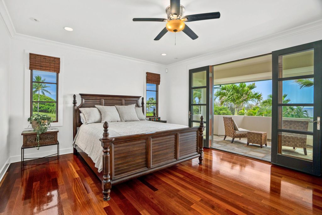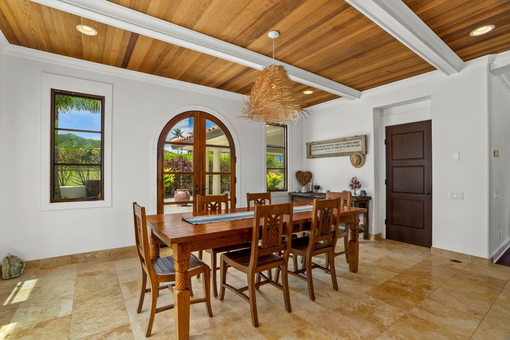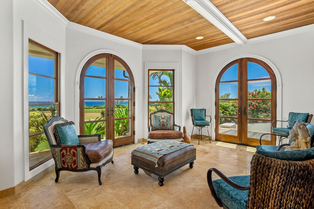 Inside the main home, Brazilian wood floors, natural wood ceilings, and arched doorways create a warm and inviting atmosphere. Large windows frame views of the ocean and Kalalea Mountain while filling the rooms with light and breezes. Sunrises greet you each morning, and every bedroom features an ensuite bathroom and private lanai. A dedicated office adds flexibility for work or creative use.