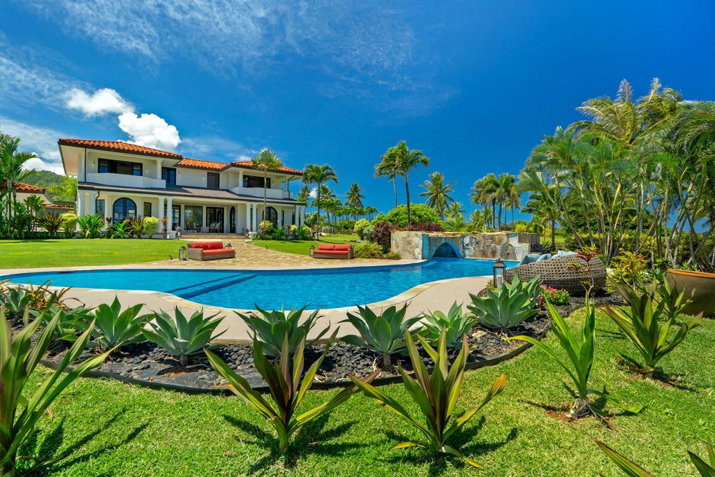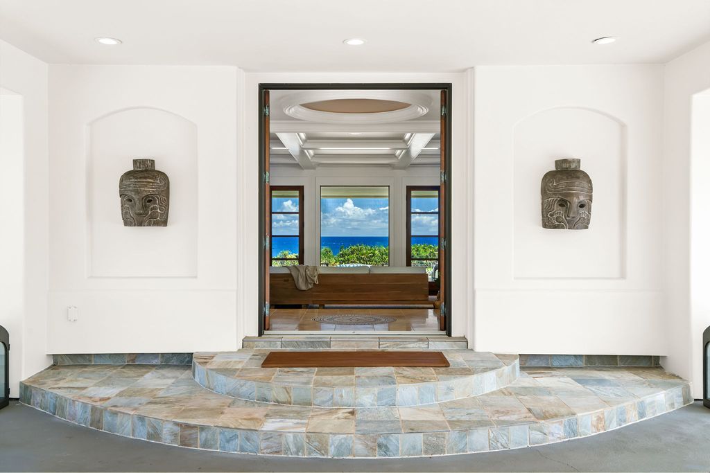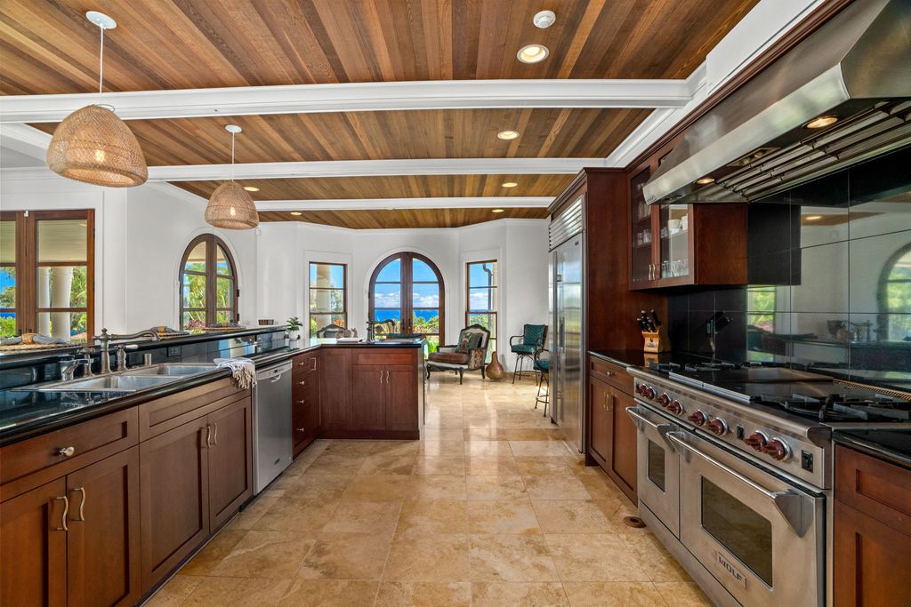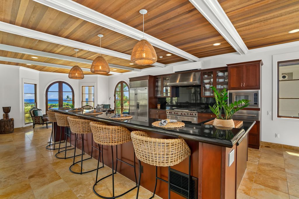 The interiors highlight a thoughtful mix of coastal comfort, Mediterranean style, and boho-inspired touches. Updated finishes bring a fresh feel throughout. The gourmet kitchen, complete with a spacious pantry and dining area, connects directly to a covered lanai, ideal for savoring the views. The in-ground pool with a waterfall and wide decks extends the living space outdoors, perfectly suited to the island setting.