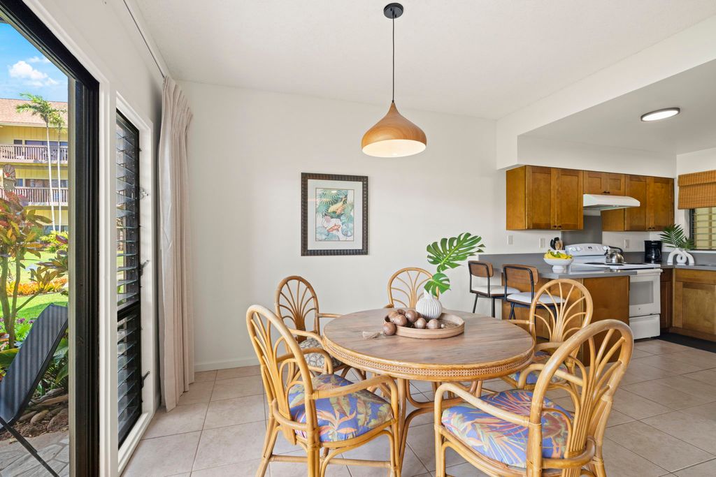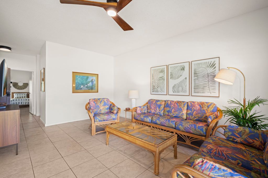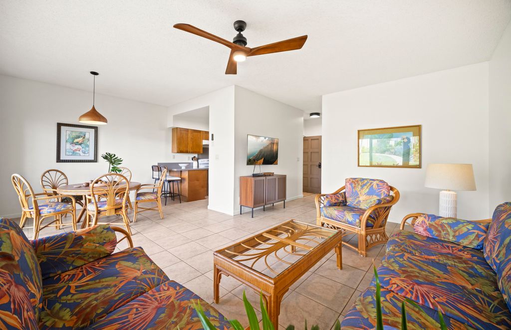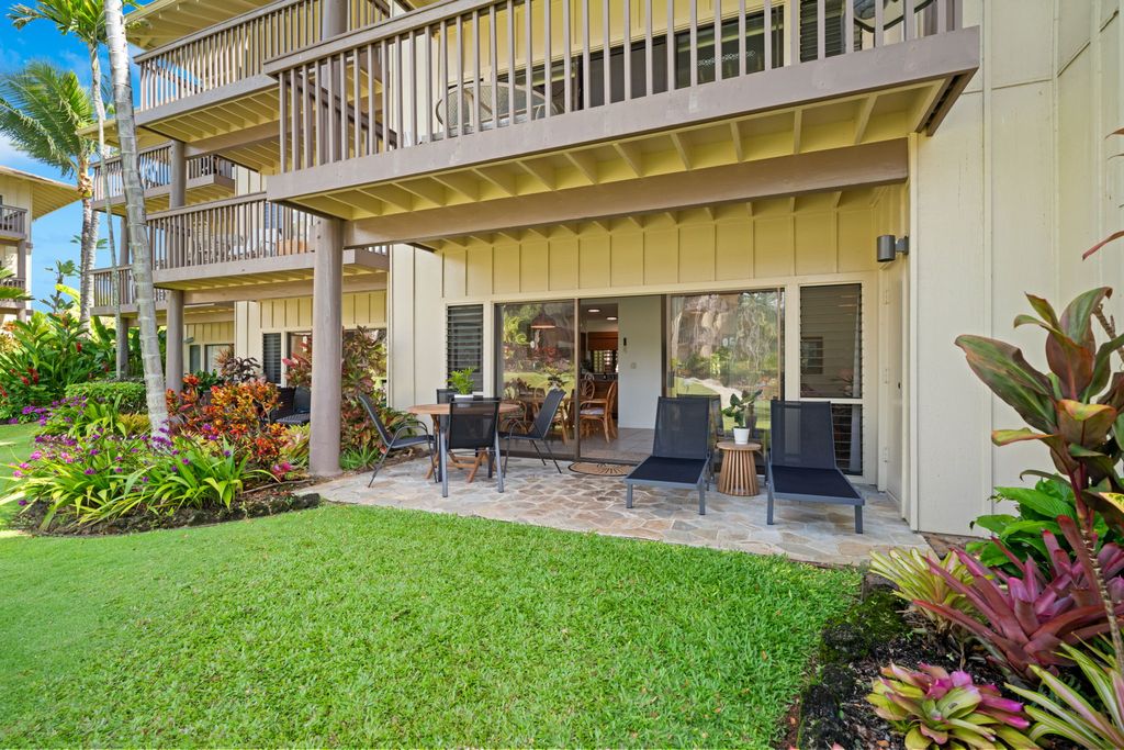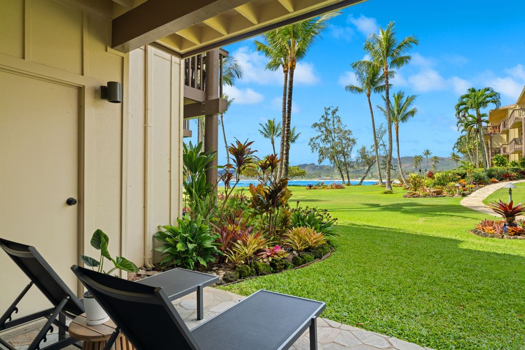 The condo's lanai overlooks expansive green lawns and palm trees, offering a serene setting for relaxation. The resort is known for its well-maintained grounds, saltwater pool, and proximity to a variety of outdoor activities such as swimming, snorkeling, surfing, and hiking.