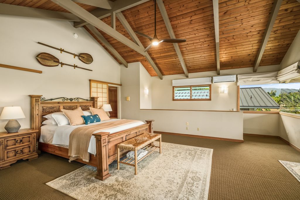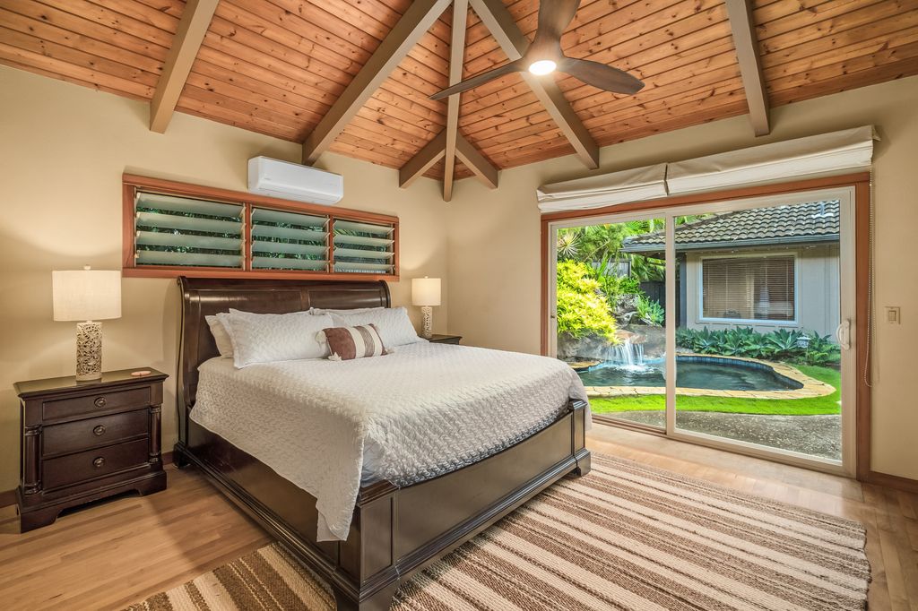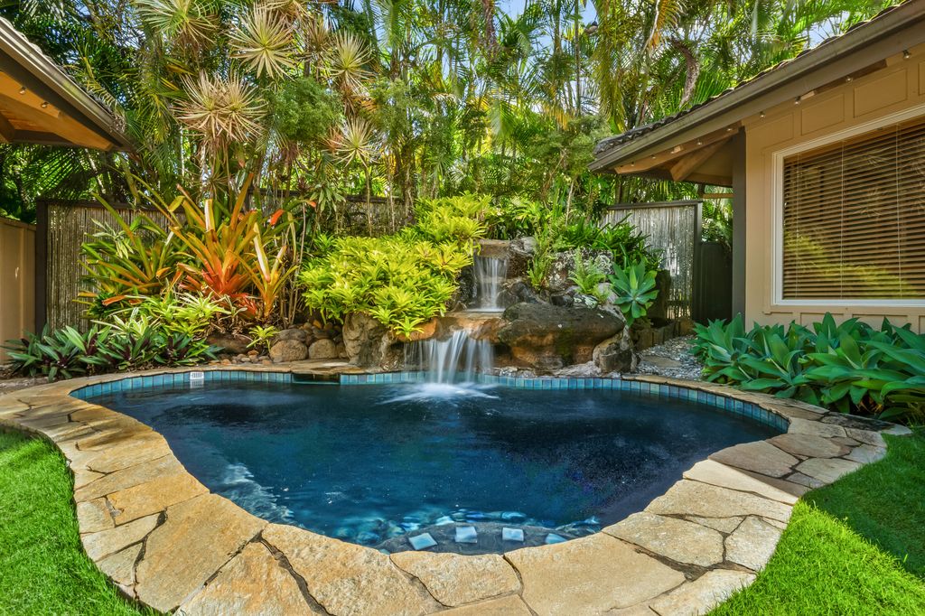 The home offers three spacious bedrooms, each with its own luxurious en-suite bathroom. The expansive main suite, located upstairs, is a private retreat with views of the ocean, a private lanai, and ample space to unwind. Two additional bedrooms on the main level open to the tranquil outdoor lanai, where a soothing waterfall cascades into a spa area"”perfect for relaxation after a day of island adventures.