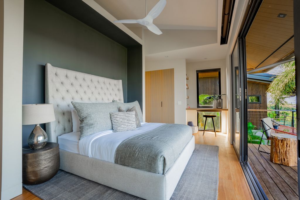 A private bridge entry leads to open, light-filled spaces designed for gathering and connection. The main living pavilion opens completely to the outdoors, drawing in the trade winds and framing panoramic views across orchards and the Pacific. With 4 bedrooms and 4.5 baths, the residence offers approximately 4,238 sq. ft. total living area, including 2,887 sq. ft. of air-conditioned interiors.
