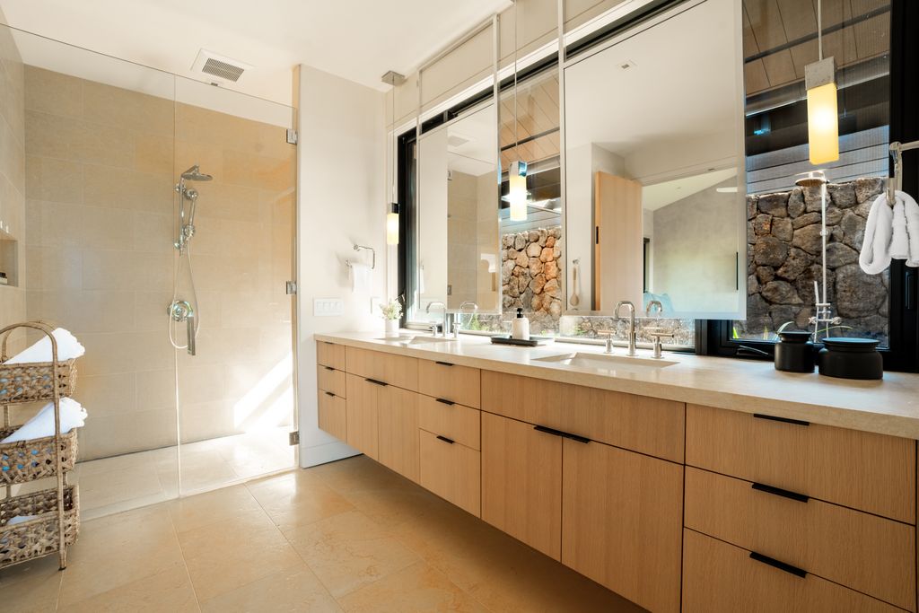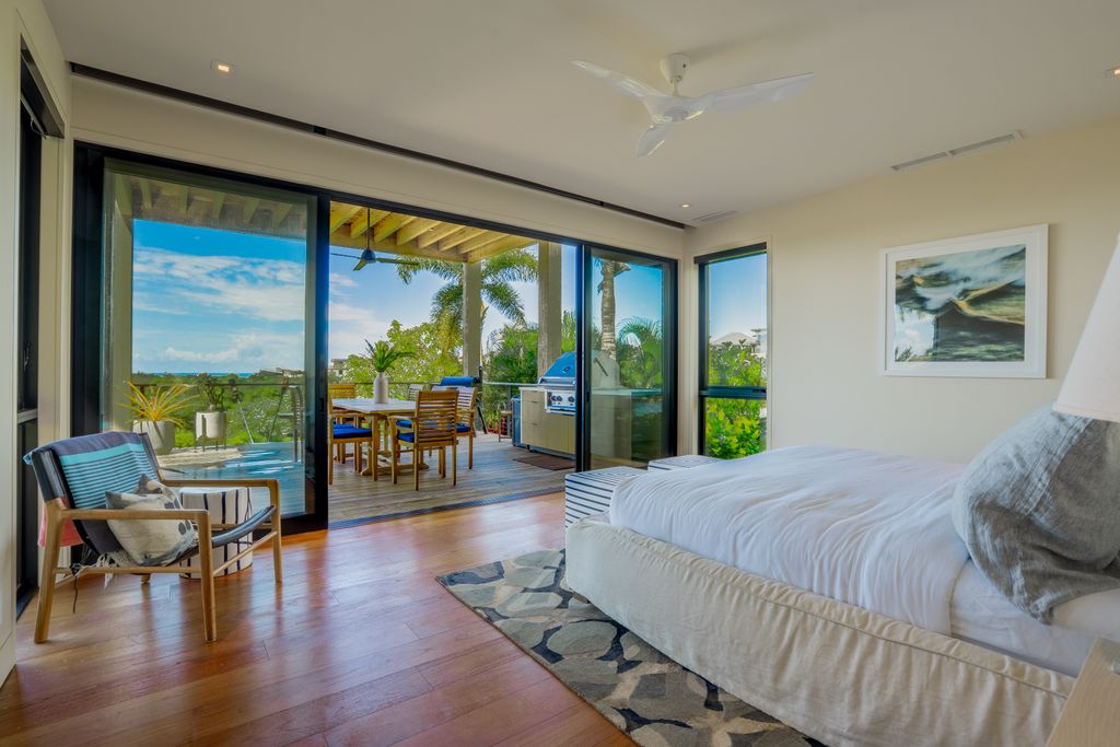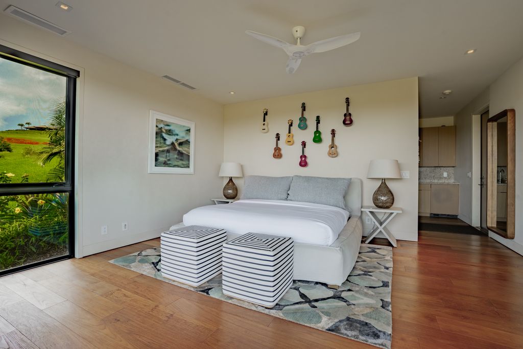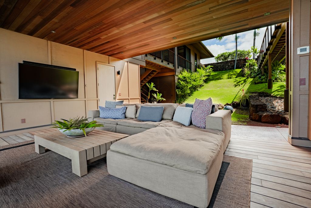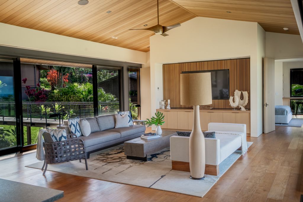 Interiors showcase a refined tropical aesthetic"”light oak cabinetry, teak hardwood floors, and granite countertops paired with clean, modern lines. The chef's kitchen features Miele appliances, a generous island that seats six, and seamless access to the covered BBQ lanai"”ideal for sunset dining and entertaining. Vaulted ceilings, glass railings, and thoughtful airflow design create the true indoor-outdoor lifestyle Kaua"˜i is known for.