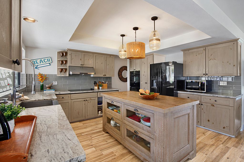 The bright and open floor plan is ideal for entertaining or relaxing after a day at the beach. The gourmet kitchen features granite countertops, modern appliances, and a spacious dining area overlooking the oversized fenced pool area. The primary suite spans the entire second floor (800+ sq ft) and features a nautical-inspired hanging bed, private lanai, and a convenient kitchenette/coffee bar"”ideal as a retreat or home office.