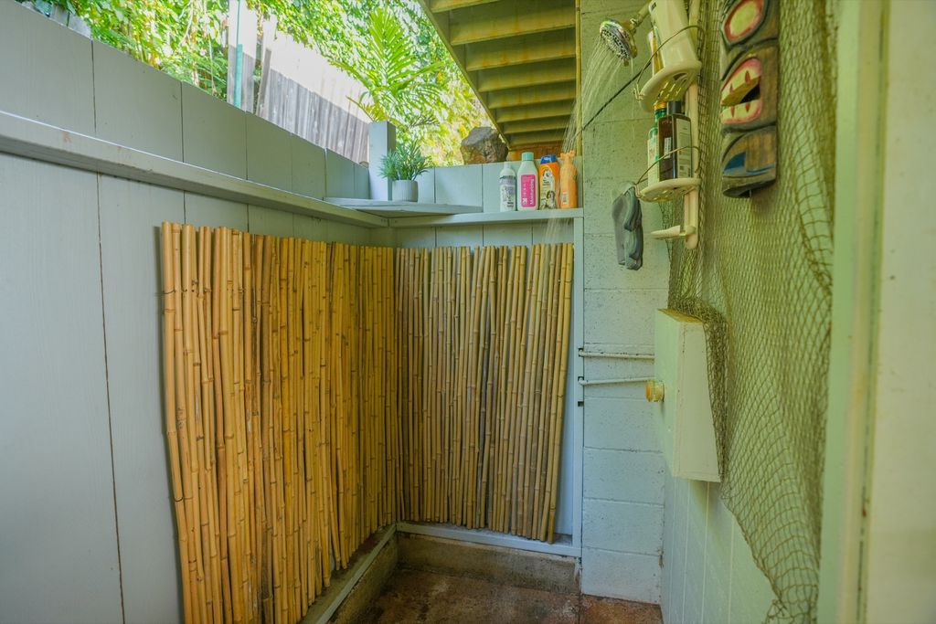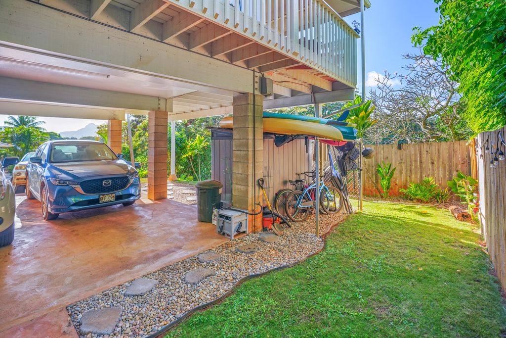 Outside, enjoy a private yard surrounded by tropical landscaping, ideal for gardening, hosting friends, or simply soaking in the beauty of Kauaʻi's natural environment. An outdoor private shower is perfect after a long day at the beach! Step upstairs and enjoy a nice dinner on the lanai as you enjoy the views of Sleeping Giant.