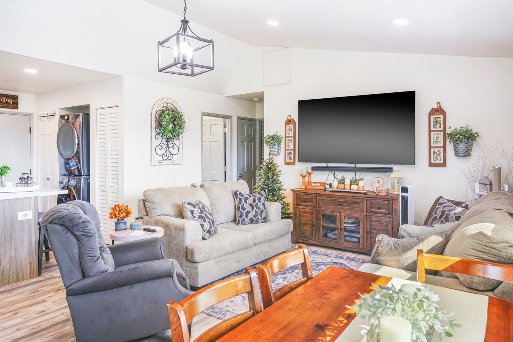 The modern kitchen is equipped with new cabinetry, quartz countertops, stainless steel appliances, and a spacious island, making it the perfect centerpiece for gatherings. Each bedroom offers comfort and style with ample storage and AC units in every room. The bathroom has been tastefully remodeled with elegant tile work and an updated vanity.