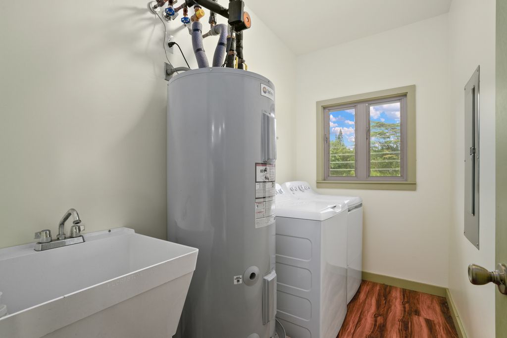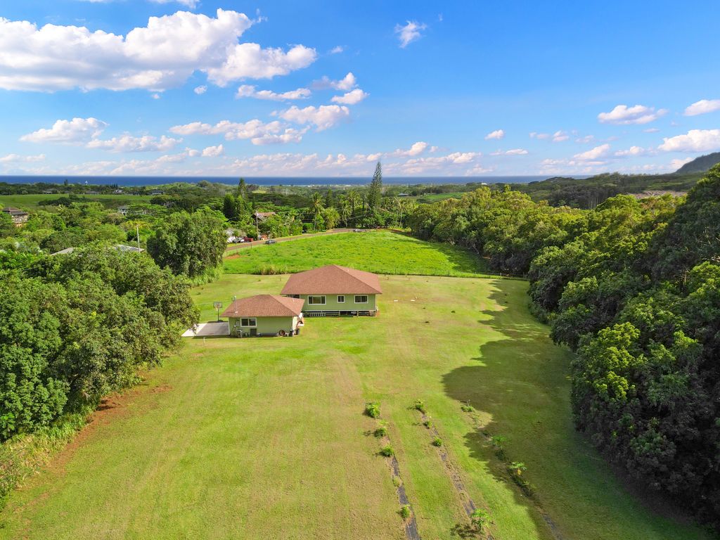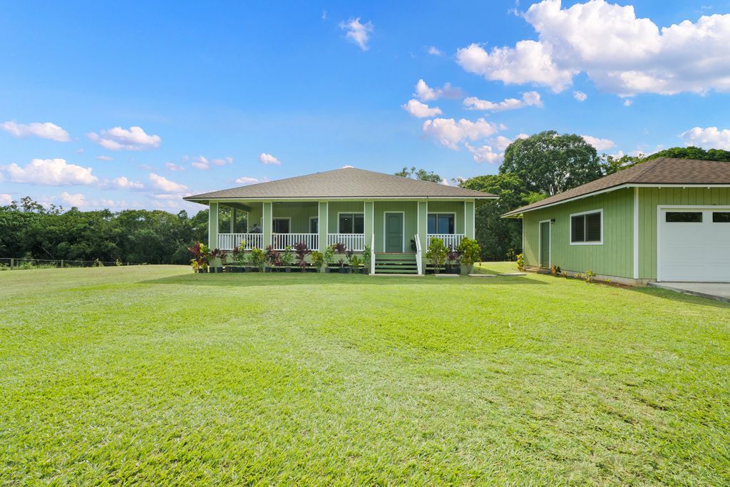 Nestled on the lush Eastside of Kauaʻi, near the majestic Makaleha Mountain with its inviting hiking trails and natural swimming spots, this charming 3-bedroom, 2-bath home sits on approximately 2 acres of serene pasture land. A large detached garage with a convenient half bath adds practical appeal, while an outdoor shower invites refreshing rinses after island adventures.