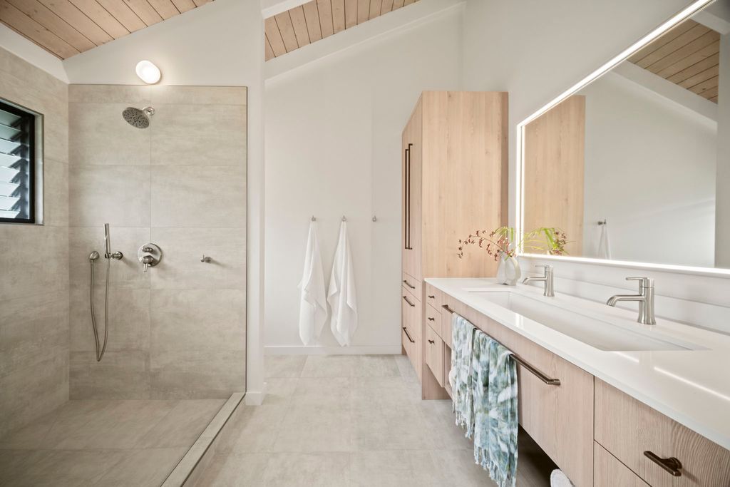 A collaborative effort by Gia Design and Rocky Mountain Hardware, the home presents a "Modern Meets Beach" aesthetic. Clean lines, natural textures, and an airy, light-filled palette are all found just one block from the world-famous Hanalei Bay.