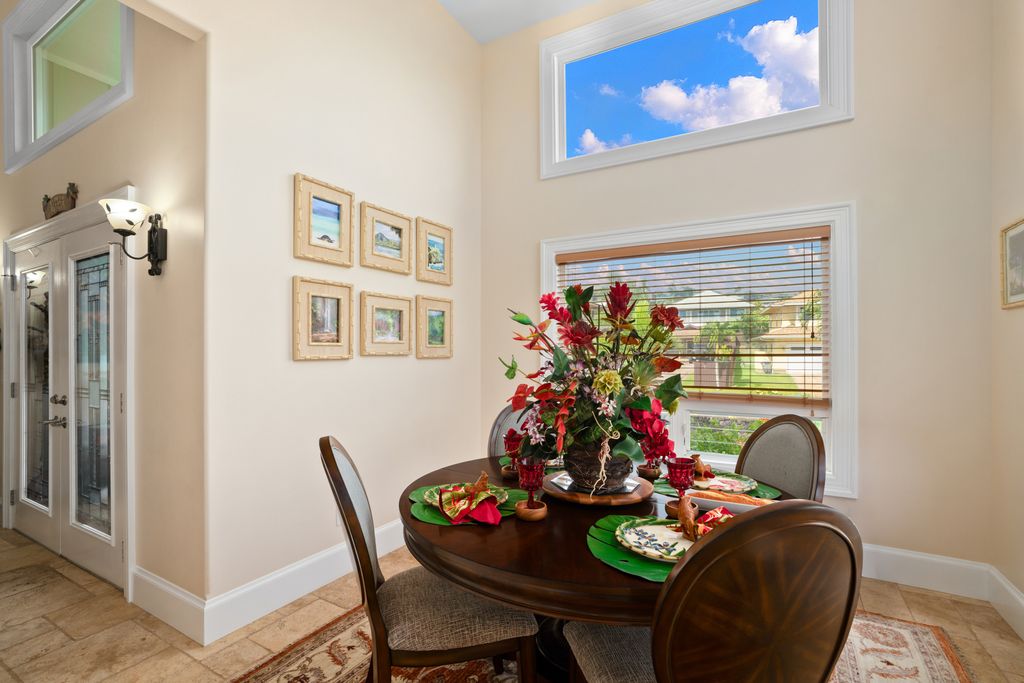 The main level features a spacious kitchen, a bright and airy living room with tall ceilings and abundant windows, a separate dining area, a primary ensuite bedroom, powder room, large covered view lanai, and a laundry room. The upper level includes two bedrooms, a full bathroom, a large covered view lanai, and a large office/sitting/home theatre room that could easily convert to an additional bedroom. The oversized two-car garage offers organized storage, a smart garage door opener & two 240v outlets for EV charging.