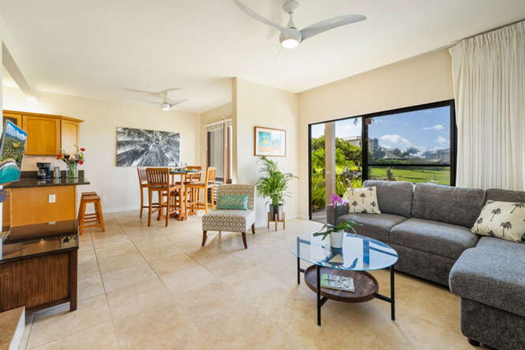 Enjoy the beauty of nearby ocean views from Kahala 311, a ground-floor condo just off the Greenbelt in Poipu Kai Resort. This South Shore Kauai two-bedroom, two-bath home welcomes you with an open floor plan, an upgraded kitchen, and updated tile flooring that flows seamlessly to your personal lanai. From here, you can relax in the Sunshine, gently cooled by the Trade Winds as you step onto the lawn, and follow the resort's coveted greenbelt pathway west to Brennecke's Beach and Poipu Beach Park - just 2 minutes away! Or take the greenbelt pathway east to Shipwreck's Beach in front of the Grand Hyatt Kauai (approximately 20 minute walk). Exclusive Resort Amenities include two in-ground Pools, a Spa, 8 Tennis/Pickle Ball Courts and Roaming Security.