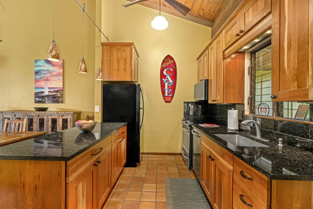 The elegant and continually maintained condominium does not disappoint. The kitchen features modern appliances, granite counters and amply sized dining area. Beyond lies the living area with vaulted tongue and groove ceilings where the furnishings are comfortable and inviting. Entertaining here is easy and offers additional space on the lanai.