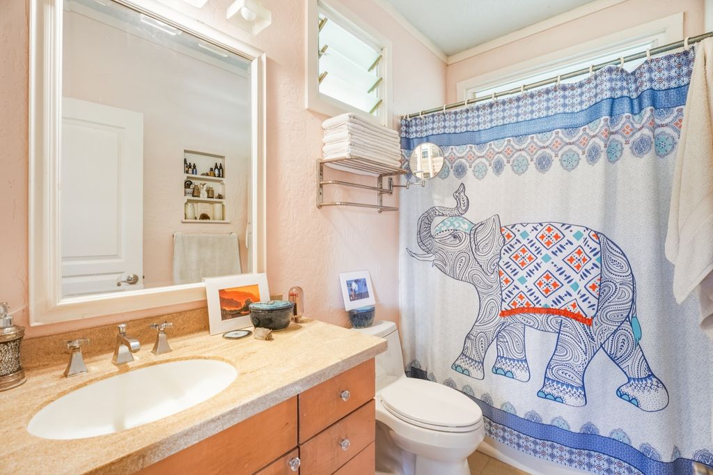 The primary residence welcomes guests with stunning rosewood hardwood floors and showcases exceptional craftsmanship throughout. Quality materials are evident from the slate entry to the travertine-tiled bath and custom finishes. The kitchen is equipped with a Wolf cooktop and oven, while additional highlights include a Whirlpool Kohler tub, charming bay windows, and Ipe-wood lanais. Both the main home and cottage benefit from solar water heating. An outdoor shower, fragrant tropical plantings, and the serene, secluded location enhance the ambiance of this unique property.