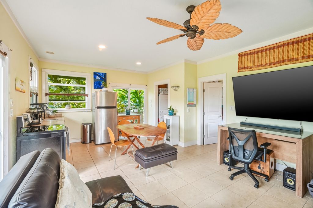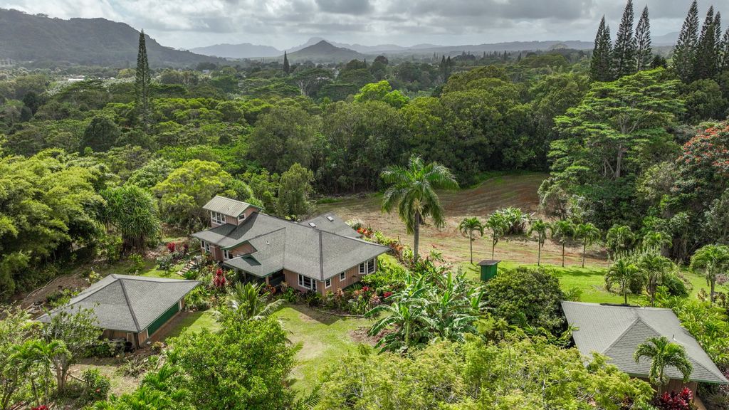 The property offers an abundant array of tropical fruit trees and botanicals, including navel orange, lemon, lime, papaya, pineapple, 11 macadamia nut trees, Samoan dwarf coconut, avocado, ginger, multiple varieties of banana, breadfruit, Surinam cherry, and tangerines. For wellness enthusiasts, the grounds also provide awapuhi ginger, noni, edible flowers, and additional culinary and medicinal plants. Flowering trees and ornamentals"”including jacaranda, puakenikeni, queen crepe myrtle, coral tree, rainbow shower, and numerous orchids"”allow for creating custom leis and vibrant floral arrangements.