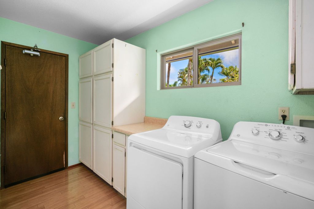 Set on a lush lot, the home has beautiful mature tropical landscaping, providing privacy and a tranquil environment. The open-concept living and dining area, paired with the high ceilings, creates a bright and welcoming space, just waiting for your personal touch.