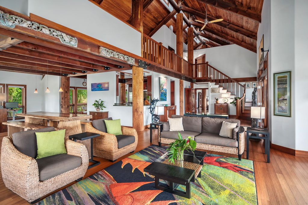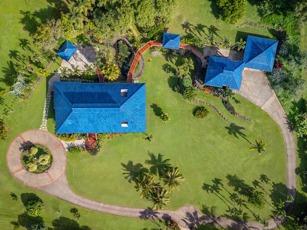 This custom home, with a striking blue tile roof, provides over 5,000 sq ft of living space across the main house and guest quarters. Expansive glass doors invite trade winds inside and frame breathtaking mountain views. Vaulted ceilings, wood floors, and oversized open-concept living and dining areas create an ideal space for entertaining.