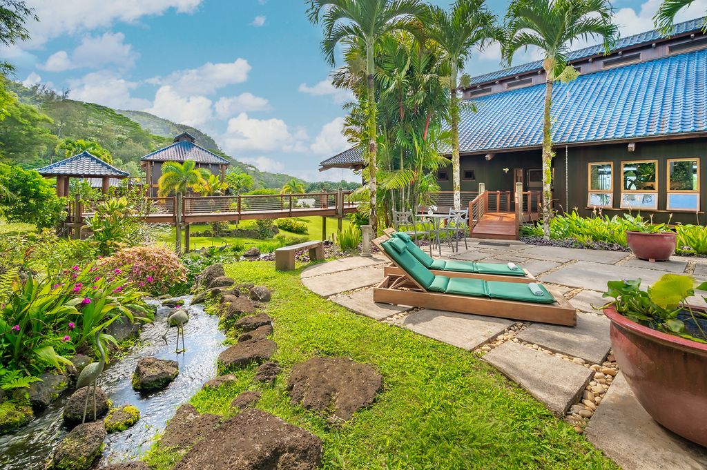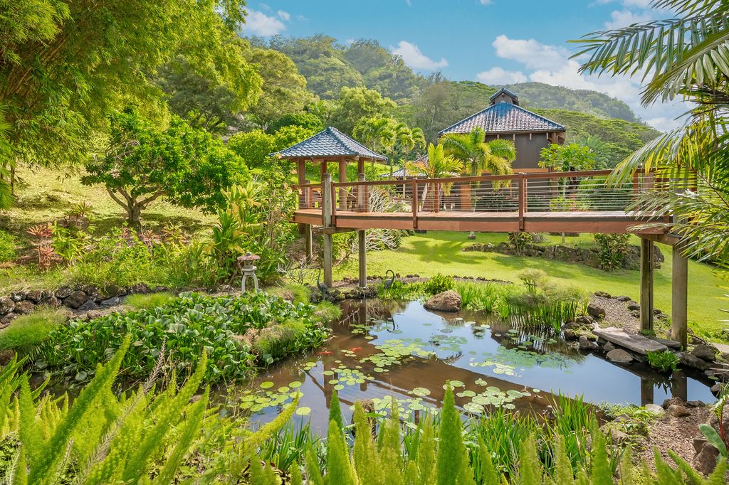 Nestled against the Nounou Forest Reserve, this exceptional 2.4-acre estate offers privacy, lush tropical landscaping, and stunning 180-degree views of Waialeale and the Makaleha Mountains.