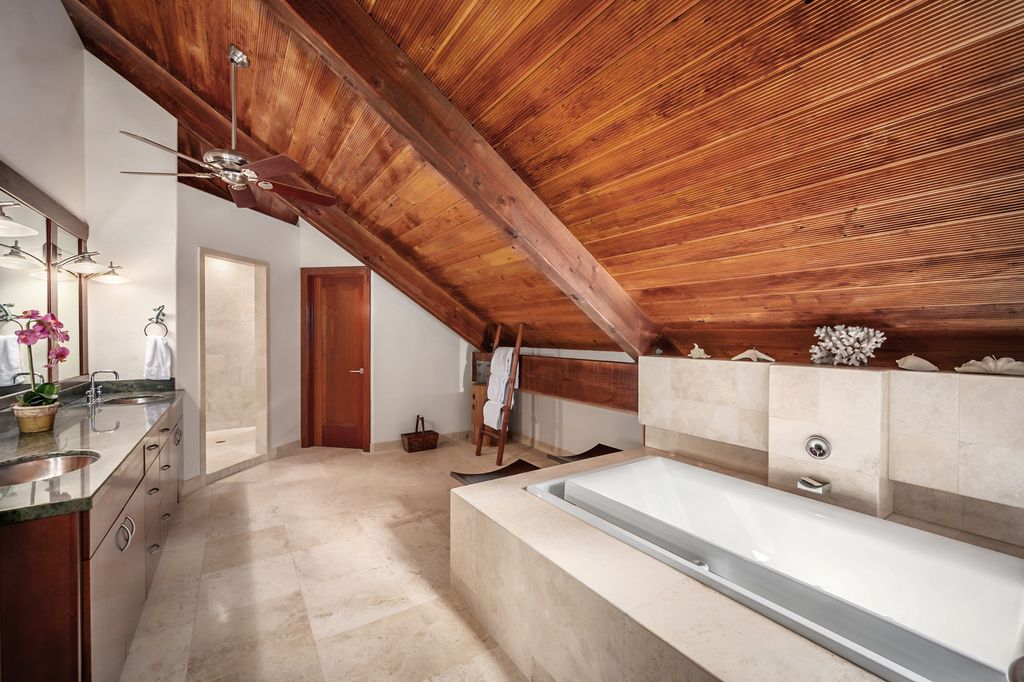 Each bedroom suite is generously sized with ensuite bathrooms featuring soaking tubs, oversized showers, and walk-in closets. The primary suite on the main floor offers single-level living with a large sitting area and expansive mountain views. Upstairs, the second primary suite opens to two private lanais and includes a connecting loft"”perfect for a sitting area, flex space, or extra bedroom.