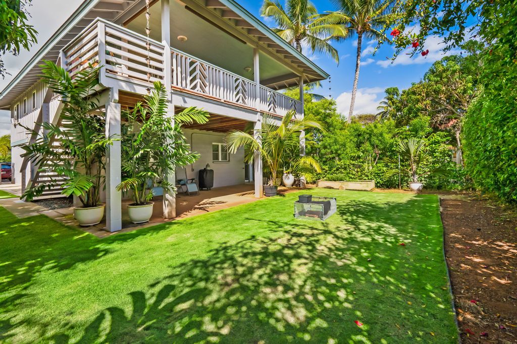 Landscaped yard with lots of tropical plants and fruit trees