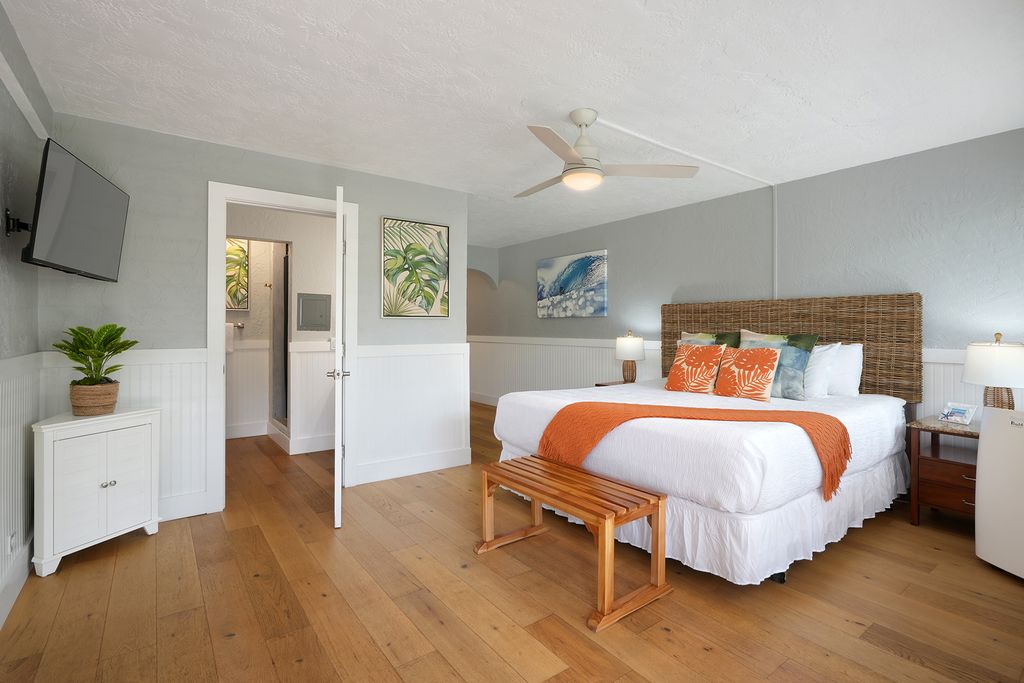 This third floor studio is a fully remodeled gem with new appliances, cabinetry, and quartz countertops in the kitchen, along with a breakfast bar and built-in desk for versatility. Unwind on a plush king mattress, stay cool with a portable air conditioner, and stream your favorite shows on the smart TV. This clean, efficient retreat has it all.
