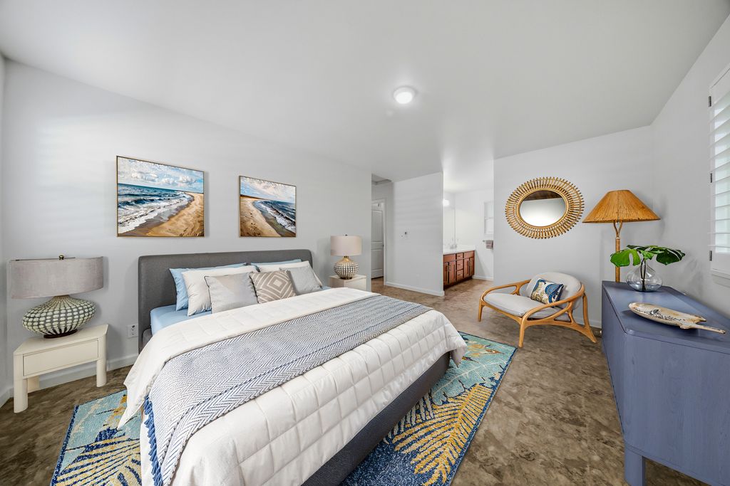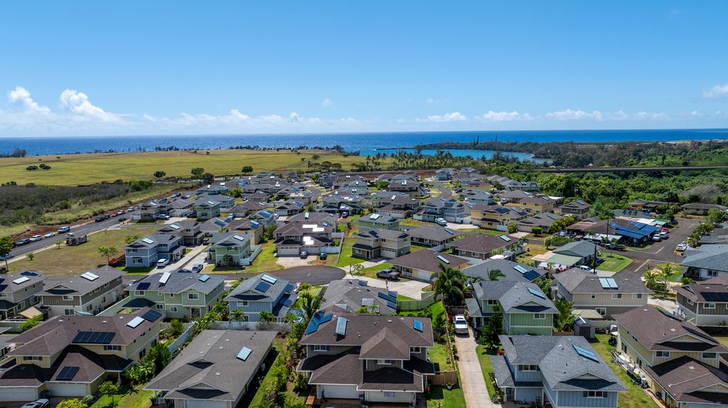 Inside, the home feels fresh and inviting. Built in 2018, it is one of north Lihue's more recent developments. The heart of the home is the chef-friendly kitchen, featuring solid surface counters, soft-close cabinetry and an abundance of storage space. New living room furniture from Otsuka's Furniture Store compliment the open floor plan. The primary suite serves as a retreat with a walk-in closet and dual-sink vanity. Hunter Douglas plantation style shutters throughout the home offer superior light control, energy efficiency and style.