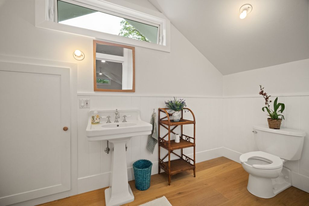 Upstairs, an 800-square-foot sunlit room with oak floors and a half bathroom offers flexibility as a studio, retreat, office, or additional living space.