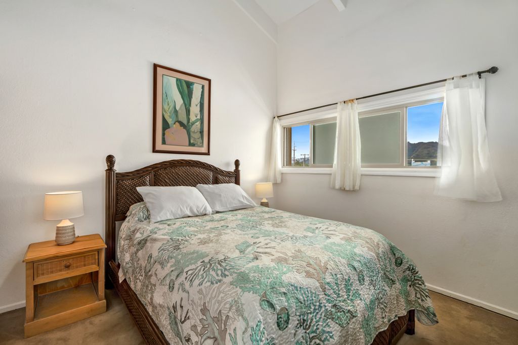 The 909 square foot interior is arranged across two levels, allowing separation between the bedrooms for added privacy. The living area opens directly to the lanai, creating a comfortable indoor to outdoor connection for dining and relaxation. The unit overlooks the resort pool, lawn, landscaped grounds, and shoreline. Enjoy the fully equipped kitchen features new induction range/oven, dishwasher and beautiful Birch wood cabinets and hardware. Offered fully furnished and turnkey. Owner's lockable closet upstairs and an additional storage loft closet in downstairs bedroom. Kapaa Shores Resort features a heated freshwater swimming pool, large hot tub, shuffleboard courts, barbecue area,
