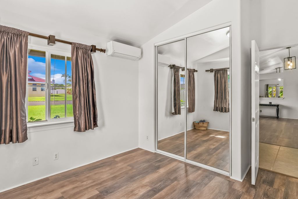 This spacious open concept 3 bedroom, 2 bath home is conveniently situated in the heart of Lihue. Enjoy stunning mountain views from the kitchen and living areas along with soaring vaulted ceilings and lots of natural light. The spacious gourmet eat-in kitchen with custom cabinets and newer appliances, opens to a large, covered lanai perfect for Hawaiian-style indoor-outdoor living. The oversized primary bedroom suite features an ensuite bath, large walk-in closet and a slider out to the expansive lanai.