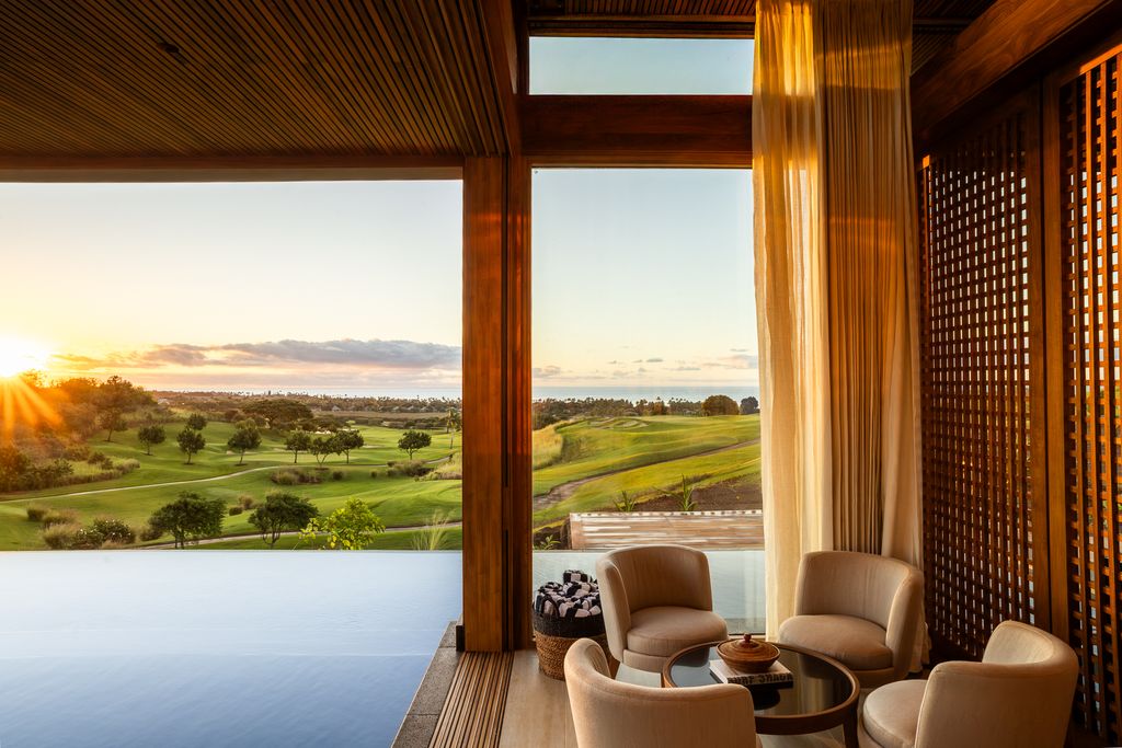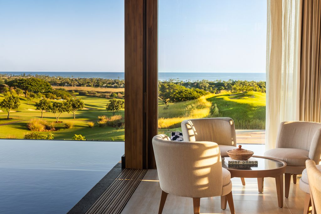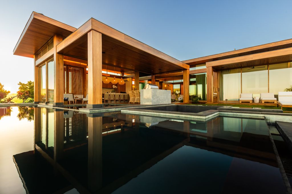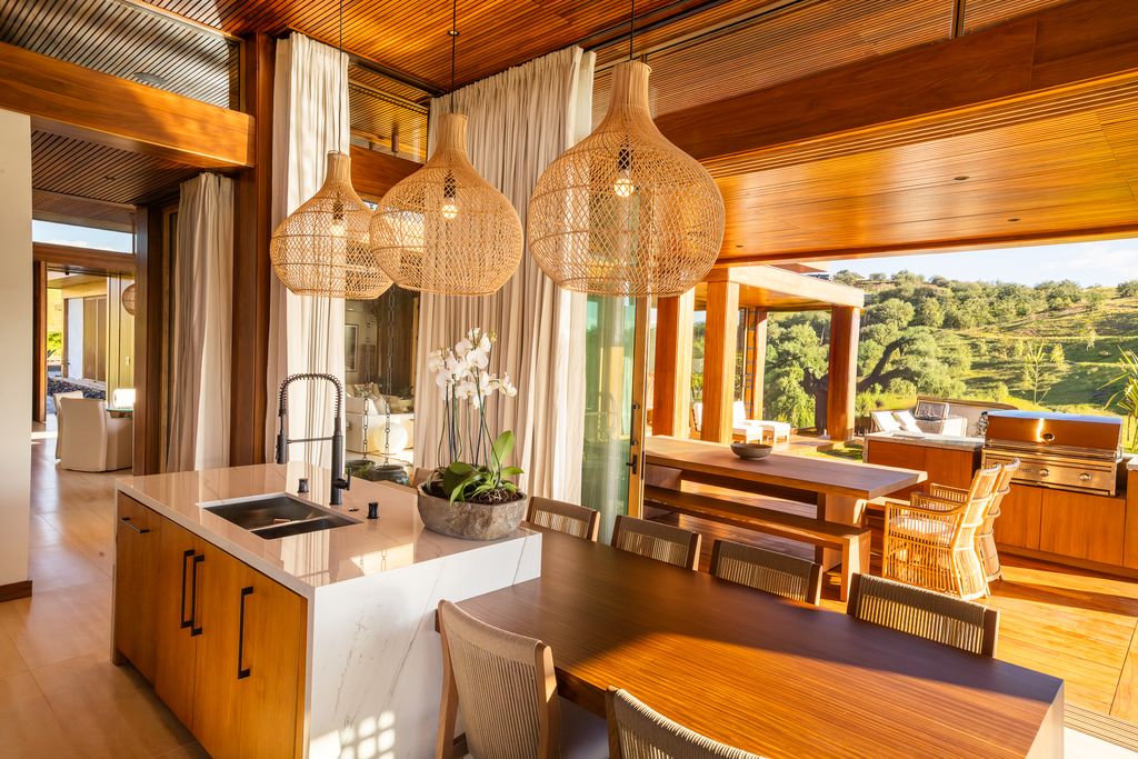 Floor-to-ceiling glass walls and sliding doors dissolve the boundary between the interior and exterior, framing uninterrupted views across the 8th hole, lush fairways, and the infinity-edge pool that stretches toward the Pacific Ocean beyond. The expansive outdoor lanaʻi becomes a true extension of the living space, complete with a fully equipped outdoor kitchen and multiple zones for entertaining or quiet retreat. The infinity pool invites laps or leisurely afternoons, complemented by a swim-in/swim-out sauna and adjacent jacuzzi for total relaxation. Evenings unfold around the outdoor fire pit, where stargazing and conversation become part of daily life.
