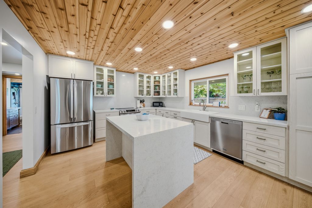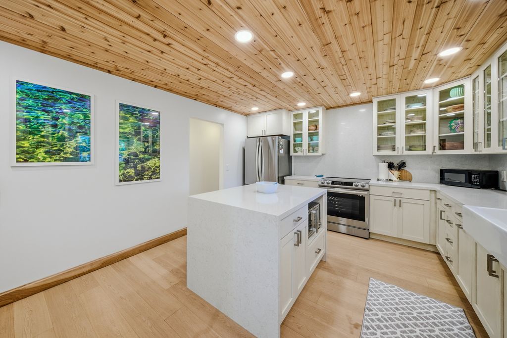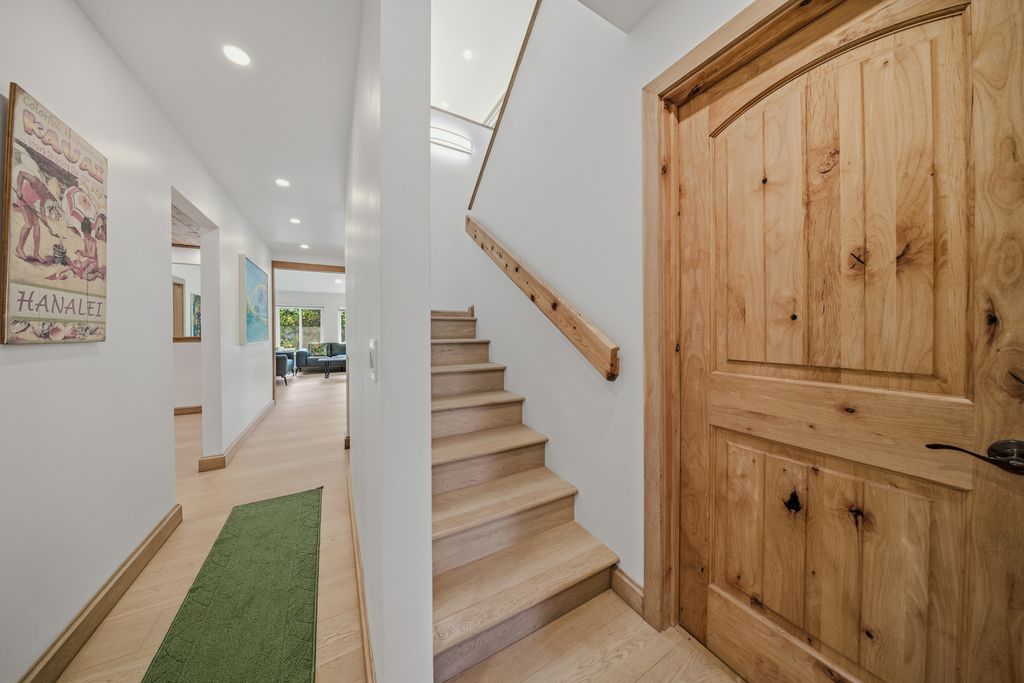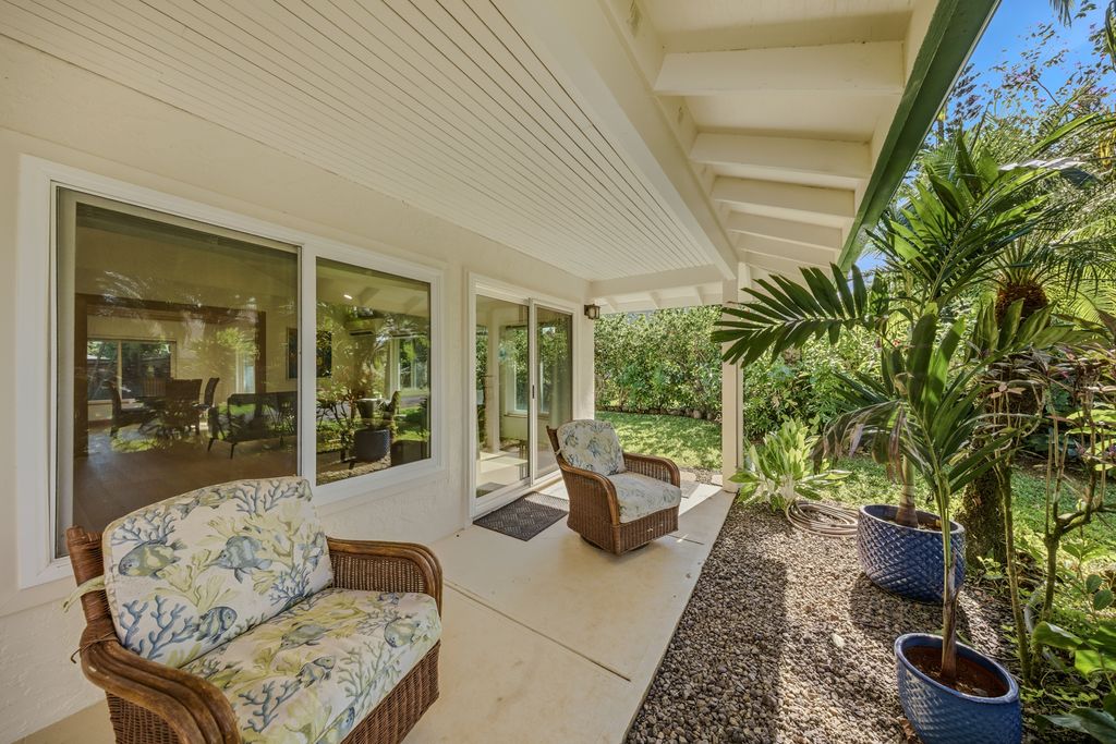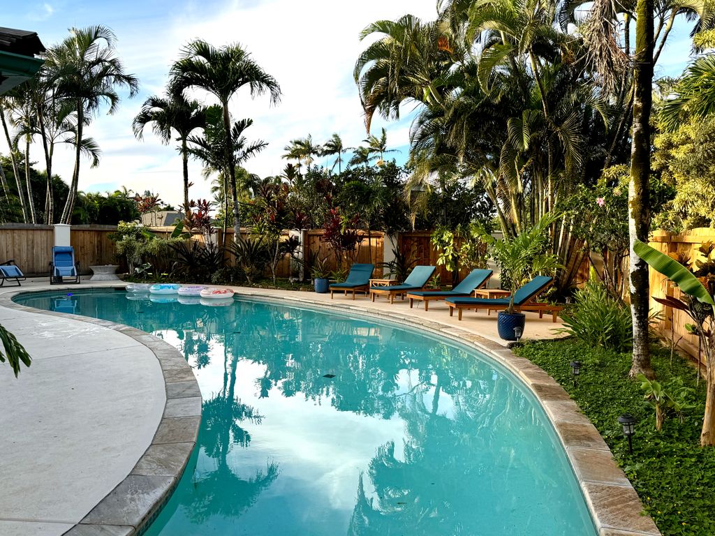 Extensively remodeled and turnkey, this 2-bedroom, 2-bath home offers a clean and modern retreat in the heart of Kauai's North Shore. The renovation which was just completed at the end of 2024 includes oak flooring throughout, custom oak trim, new kitchen and bathrooms, all new lighting, air conditioning throughout, new interior and exterior paint, new fencing, and a new pool heater with a saltwater filtration system, as well as numerous other upgrades. The comforts of this home extend outside with a private, fenced-in pool that is surrounded by newly installed landscaping and irrigation, as well as an outdoor dining patio that is ideal for hosting guests.