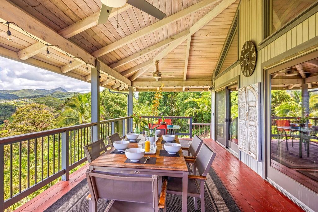 Perfect as a multi generational family home or currently permitted since 2019 as Marjorie's Kauai Inn. Live upstairs in the Host quarter's Primary ensuite set at the end of the hallway from the spacious Living & Dining areas that open to a well stocked Gourmet Kitchen and a HUGE covered Lanai - perfect for communal outdoor dining where breakfast is conveniently served Monday thru Saturday, as the owner obtains income from three deluxe ground floor suites, each with private entrances that offer both privacy and flexibility.