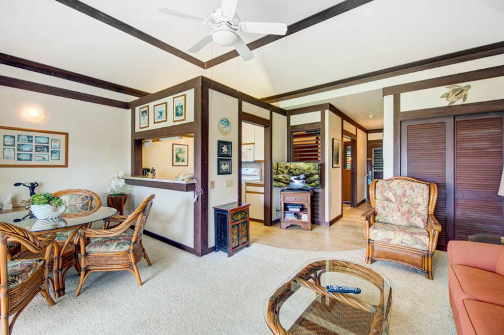 Sitting on the top floor of one of the more intimate buildings at Kiahuna Plantation, this condo is all about the ocean. White-water views, steady trade winds, and the kind of setting that reminds you exactly why people fall in love with Kauai. The outlook is open"”expansive lawn, palm trees, and the Pacific right in front of you"”with direct access to the beach just steps away.