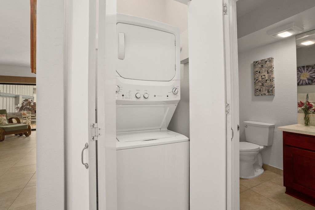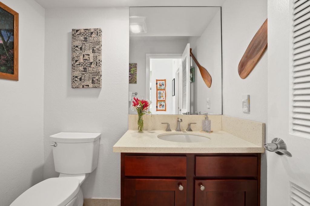 The level no stair entry is more private than most and the unit that this building is in sits well off the road. Tile flooring throughout which extends to the spacious lanai. Kitchens and bathrooms have been updated and the primary suite has A/C and an ensuite bath with an easy-care Kohler Choreograph shower and double sinks. There is also an additional half-bath which is not common for 1 bedrooms and is an exceptional feature for larger parties that are staying in the unit and guests.