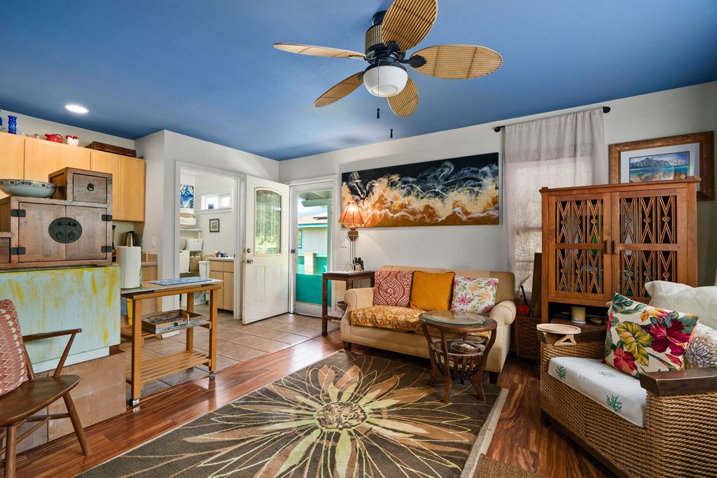 Large west-side home with attached comfortable studio apartment. Property backs up onto open land which gives it a quiet, rural feeling. High open beam ceilings and updated kitchen in the great room. Two bedrooms, two and a half baths are featured in the main part of the house, with two additional rooms which may have multiple uses.