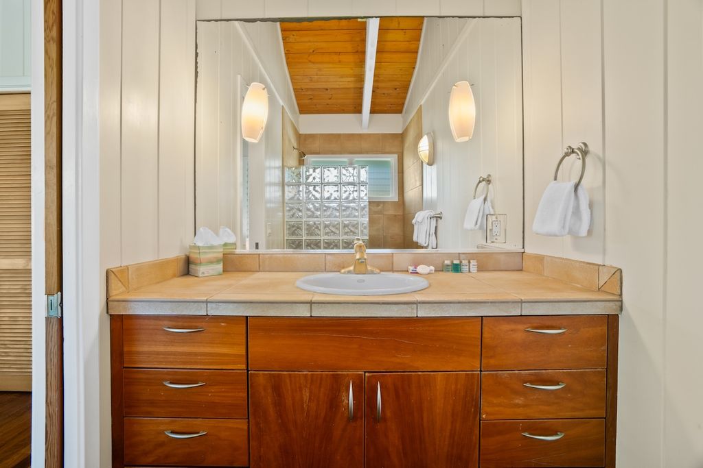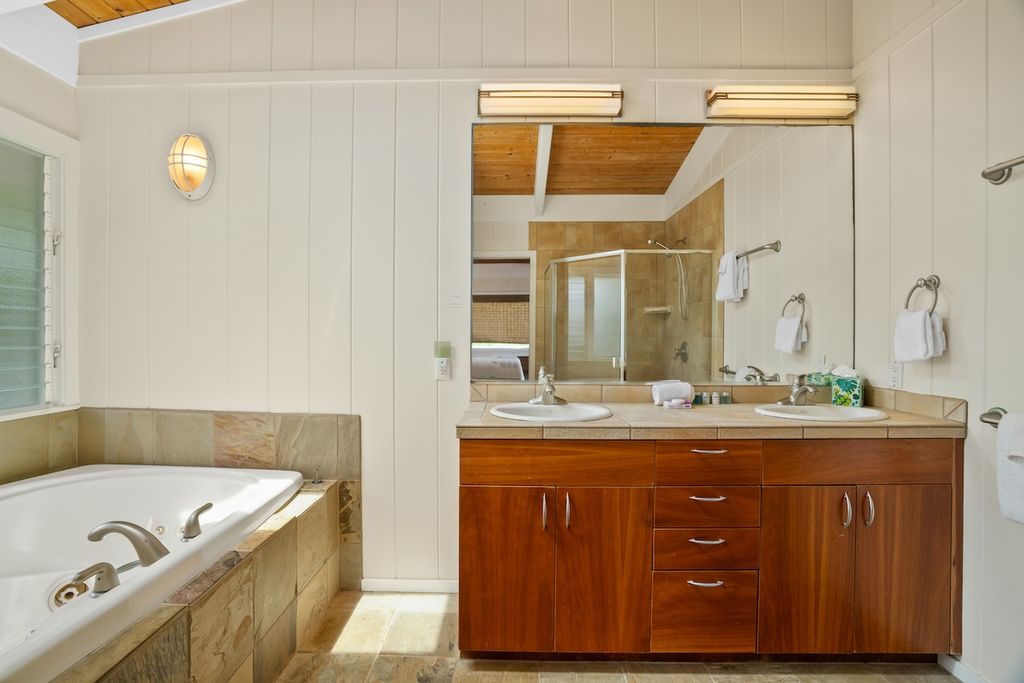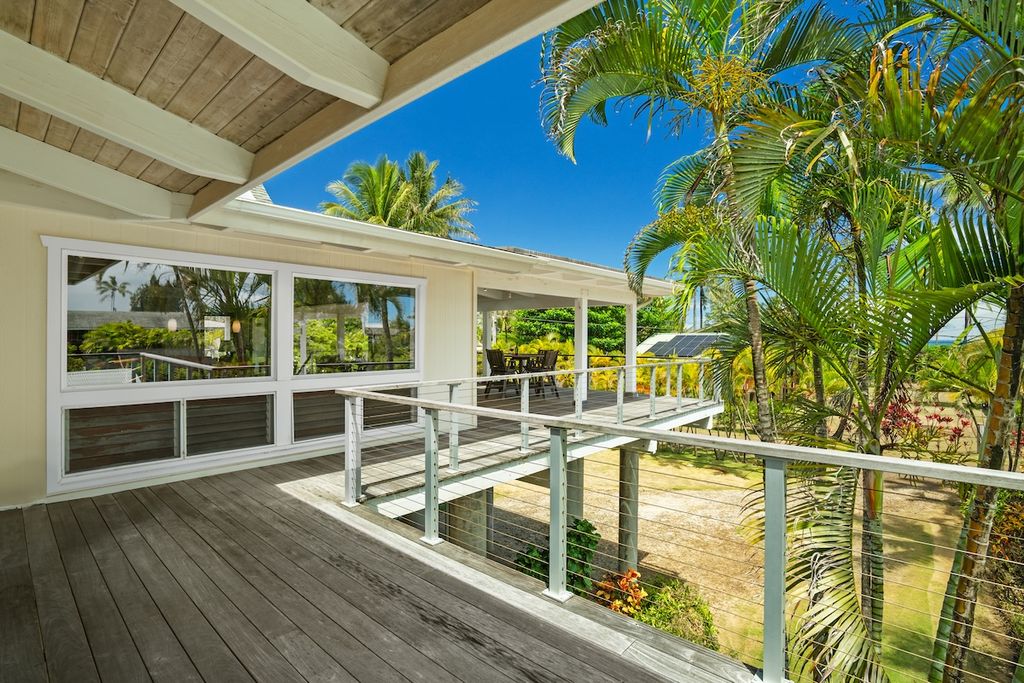 Vaulted ceilings, hardwood and slate flooring, and teak, koa, and bamboo furnishings enhance the home's tropical ambiance. A remodel was completed in 2018, including the expansion of a spacious covered lanai. A new roof with warranty was installed in September 2024.