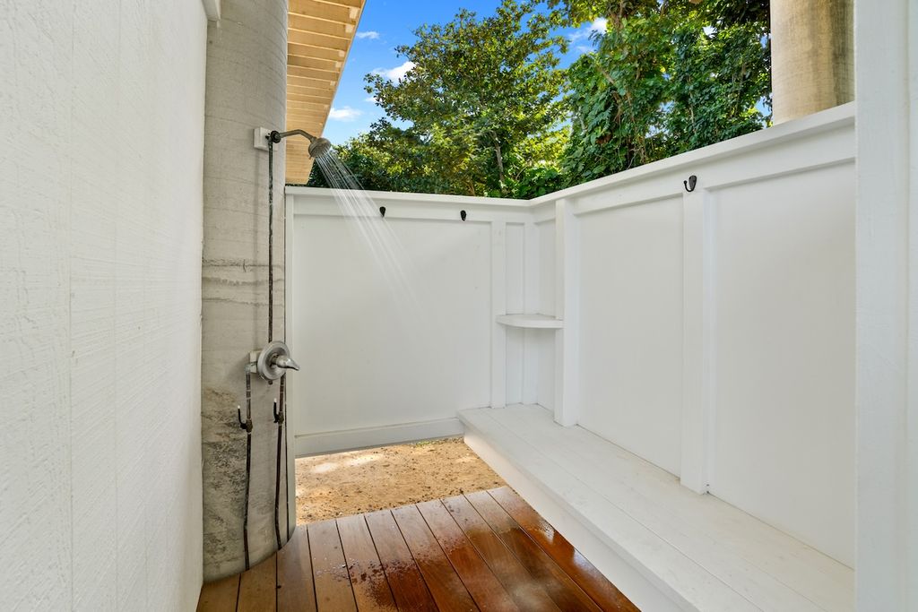 A new outdoor shower and foot rinse are conveniently located downstairs for rinsing off after the beach, along with a dedicated storage closet for beach gear.